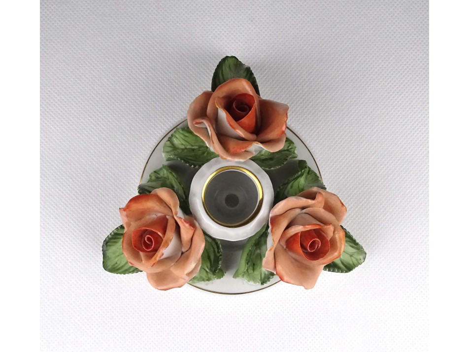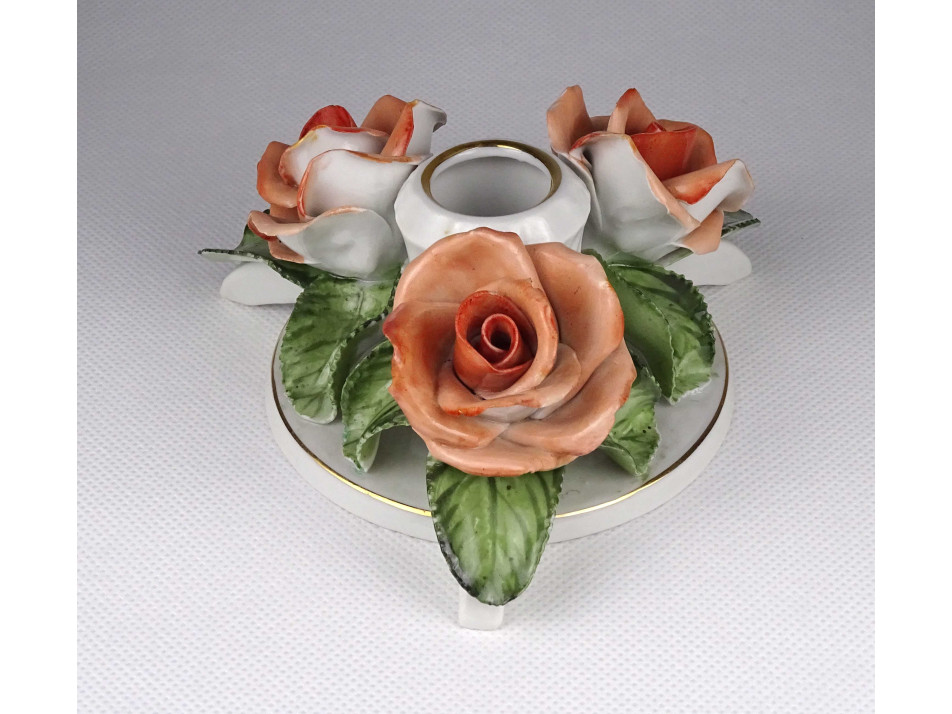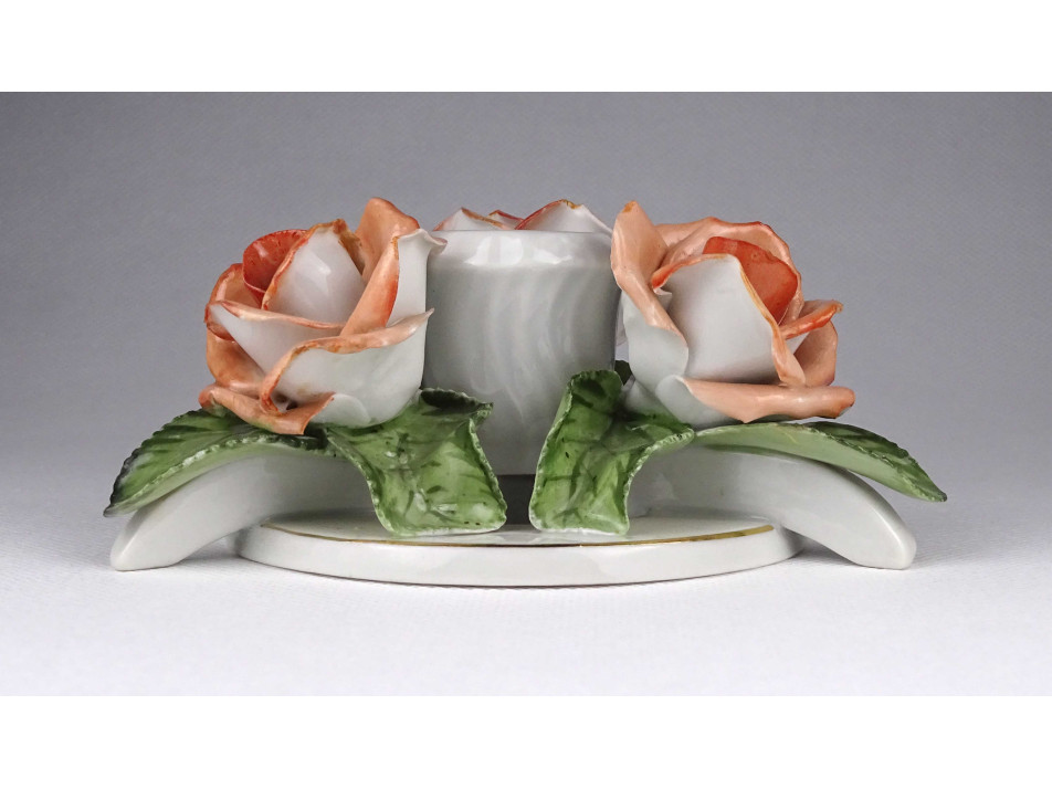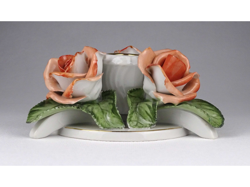 Szép állapotú, Herendi porcelán gyertyatartó három plasztikus vörös rózsával díszítve. A rózsák szirmai és levelei restaurátor által szakszerűen javítottak.
