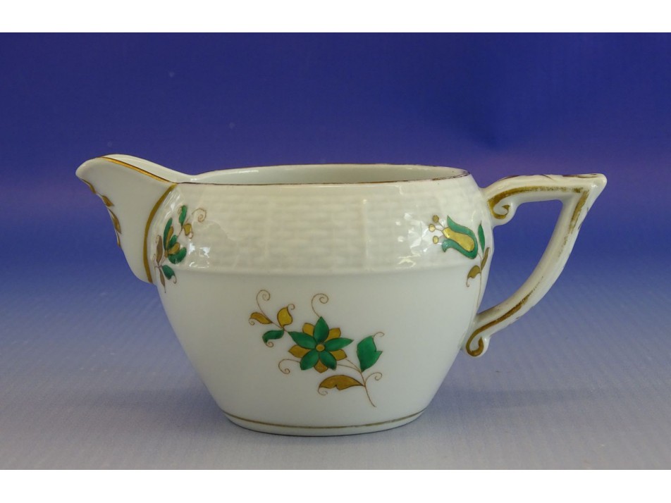 Régi, szép állapotú, Herendi porcelán tejszín kínáló. Oldalán apró arany és zöld színekkel virágmotívumok láthatóak.