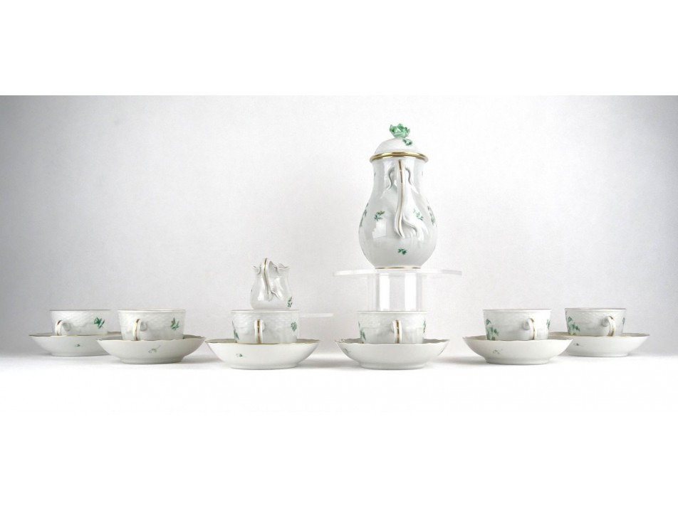 Hibátlan állapotú, 14 darabos zöld virágmintás Herendi 6 személyes porcelán kávéskészlet.