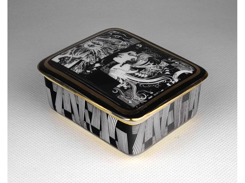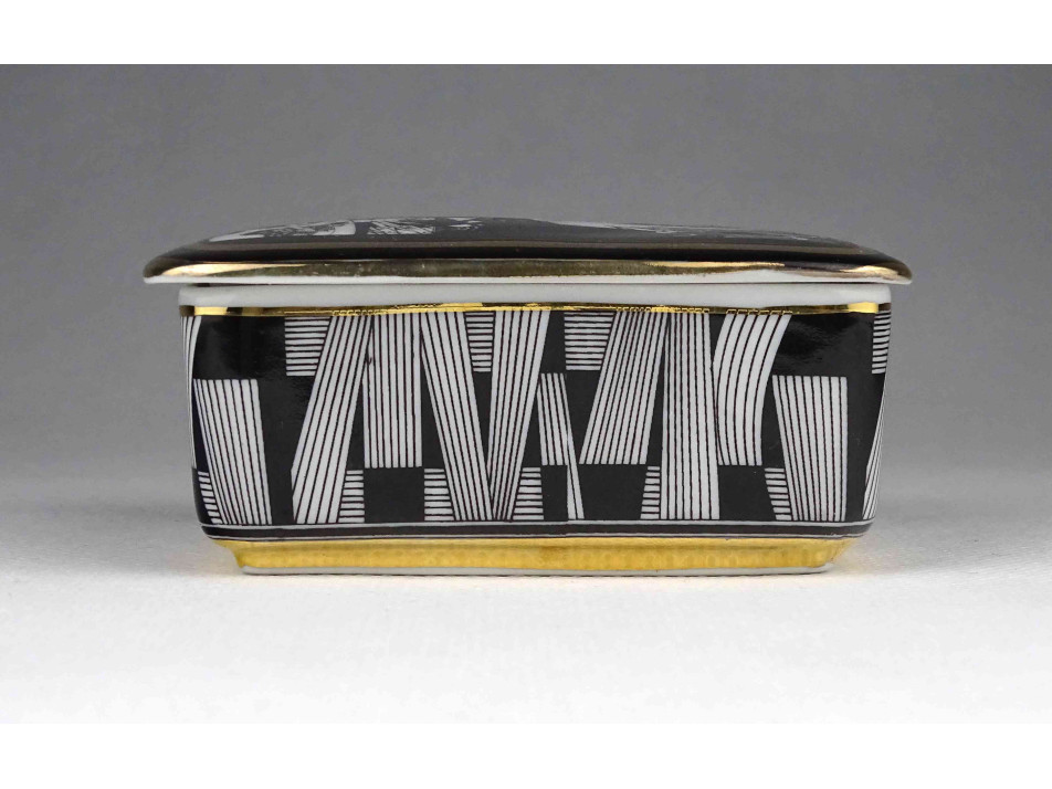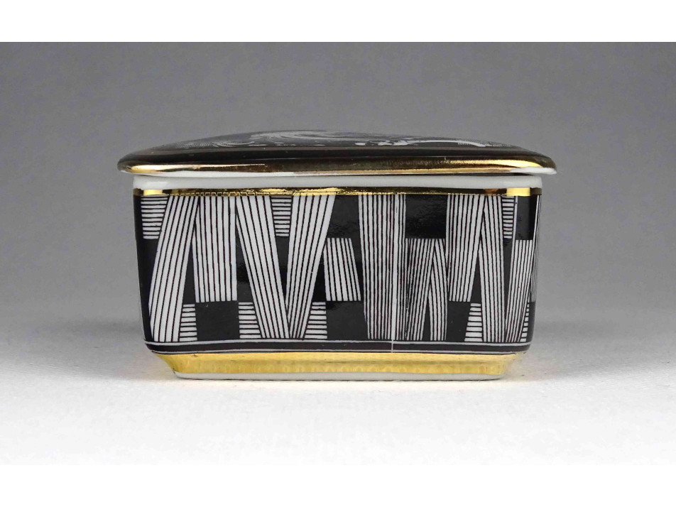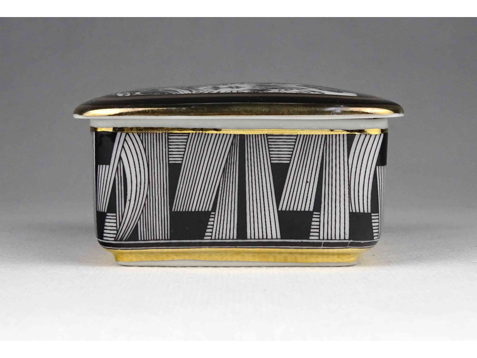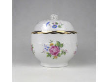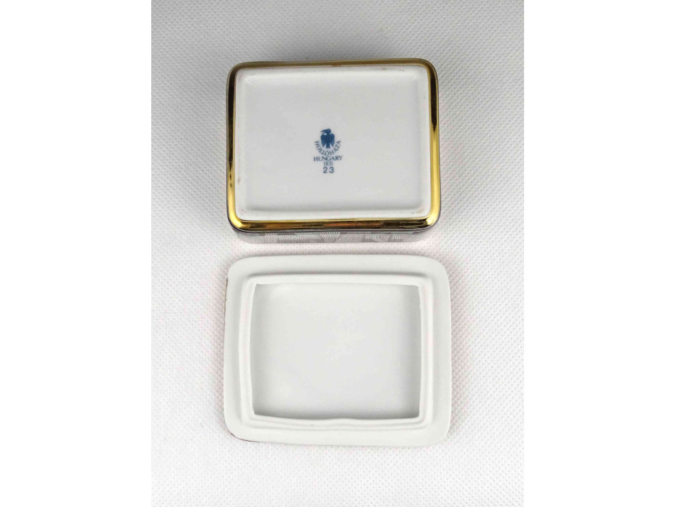 Hibátlan állapotú porcelán bonbonier. Fedelén és körben Szász Endre által készített motívumok láthatók. A bonbonier fedelén Szász Endre szignó található.