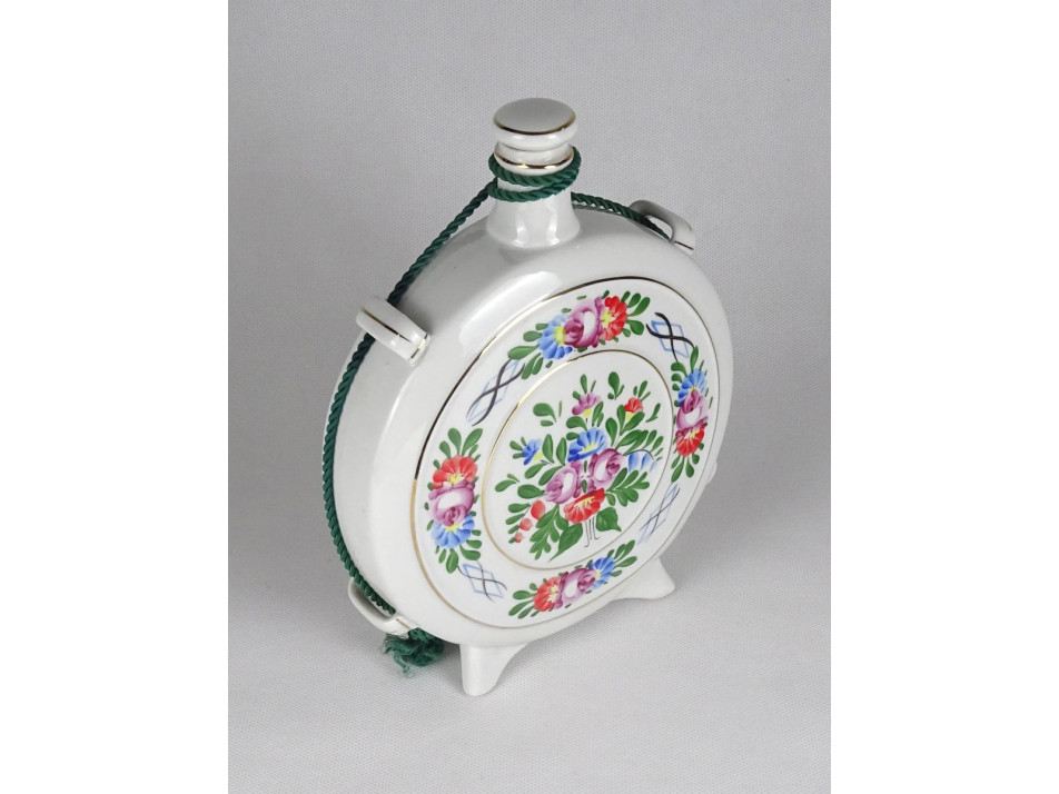 Régi, hibátlan állapotú nagy méretű Hollóházi porcelán kulacs, pálinkás butella, oldalán színes kézzel festett virág díszítések. Dugója is megvan.