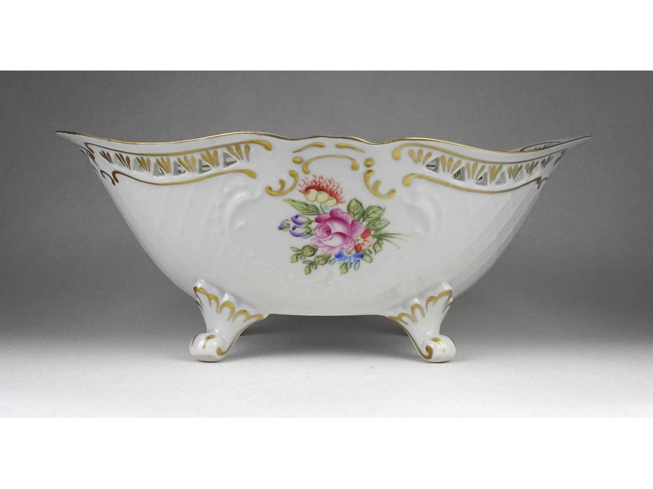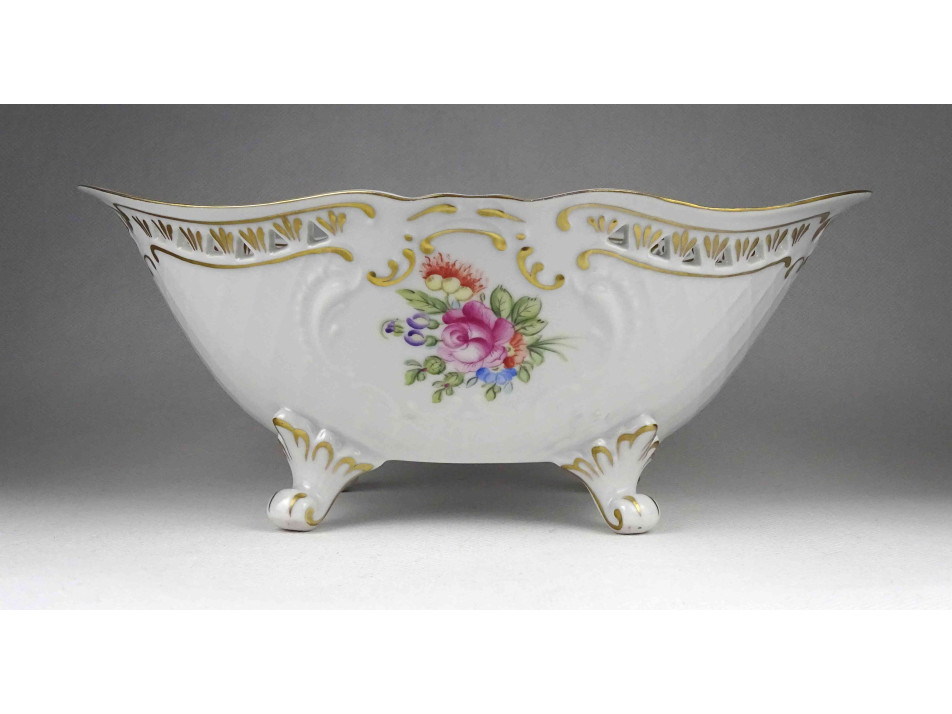 Hibátlan állapotú, jelzett, virágcsokor mintás, aranyozott peremű, áttört szélű, négy lábon álló, ovális alakú Hollóházi porcelán dísztál, kínáló tál, asztalközép kínáló.