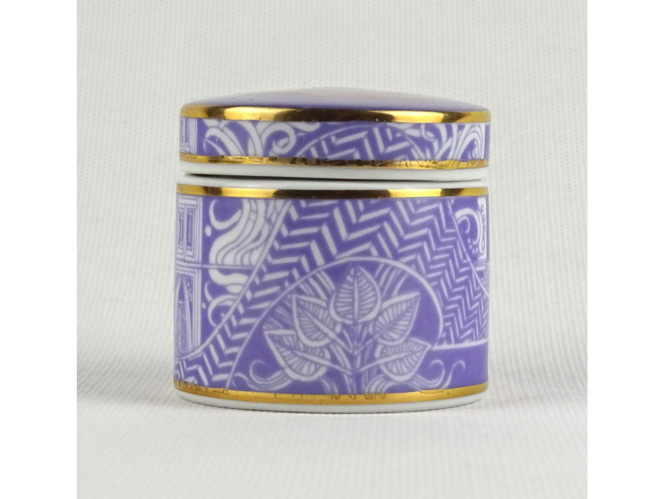 Hibátlan állapotú, vastagon aranyozott, ritka, lila porcelán tégely. Oldalán körben Szász Endre által készített motívum látható. Oldalán, a díszítő motívumok között jelzés, szignó is látható, lásd fotó.