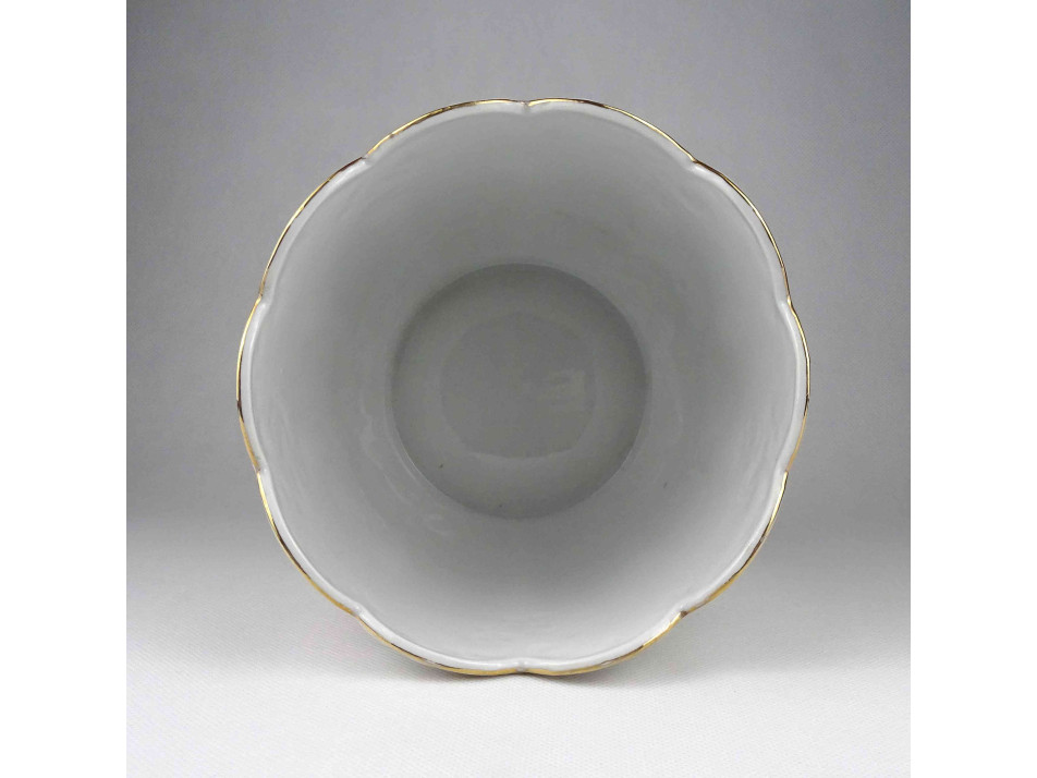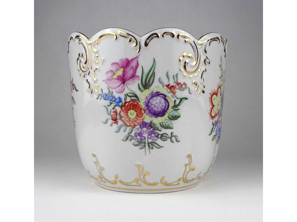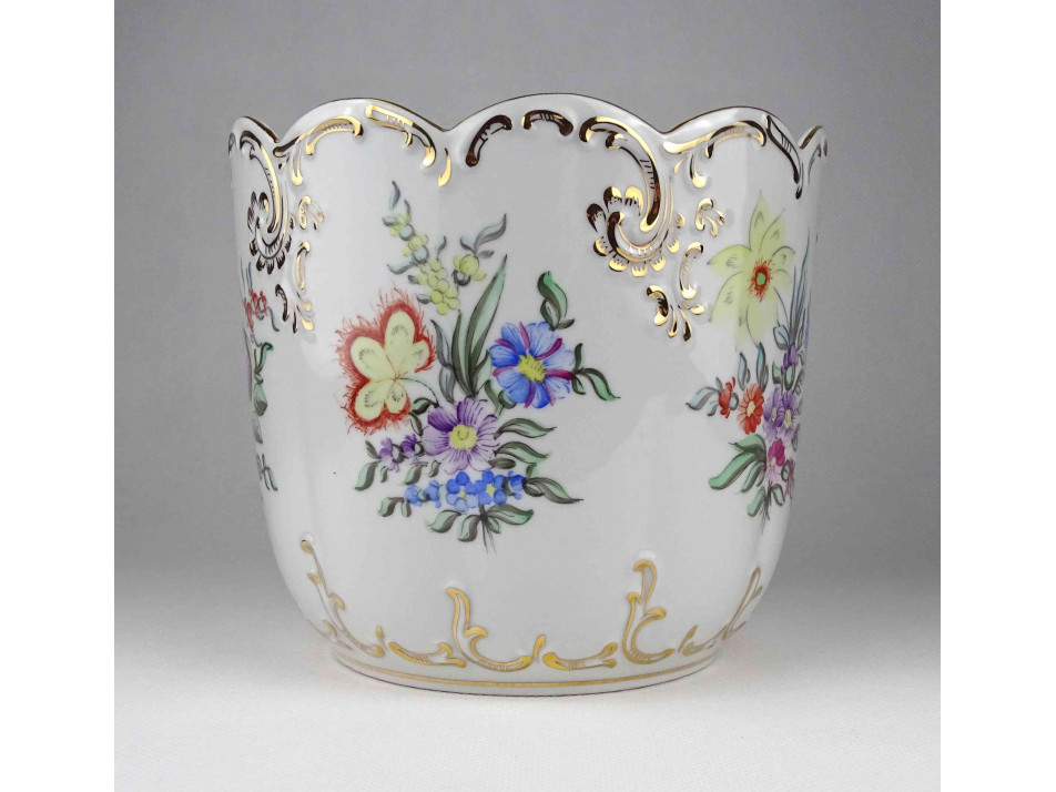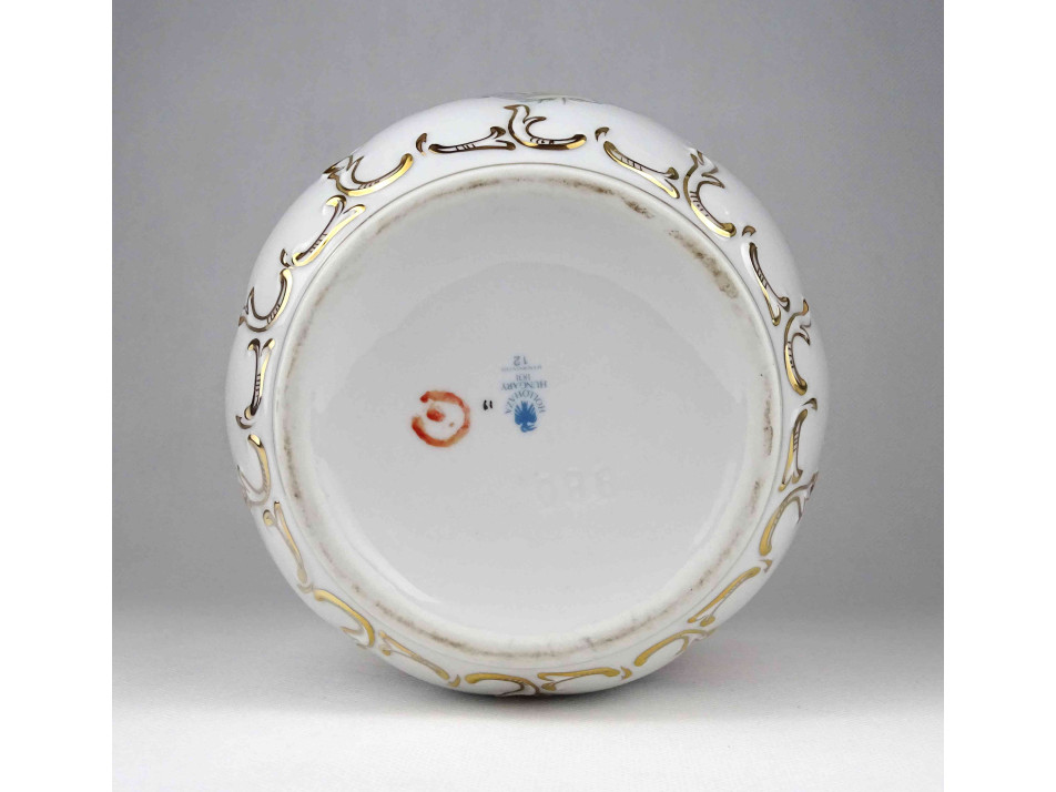 Hibátlan állapotú, nagyméretű, barokkos formavilágú, gazdagon aranyozott, kézzel festett virágmintás, jelzett Hollóházi porcelán kaspó.