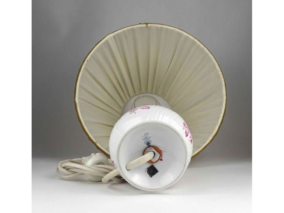 Hibátlan állapotú, krémszínű textilbúrás, rózsaszín virágmintás Hollóházi porcelán asztali lámpa, működő állapotban. Nagyméretű (E27) izzó való bele.