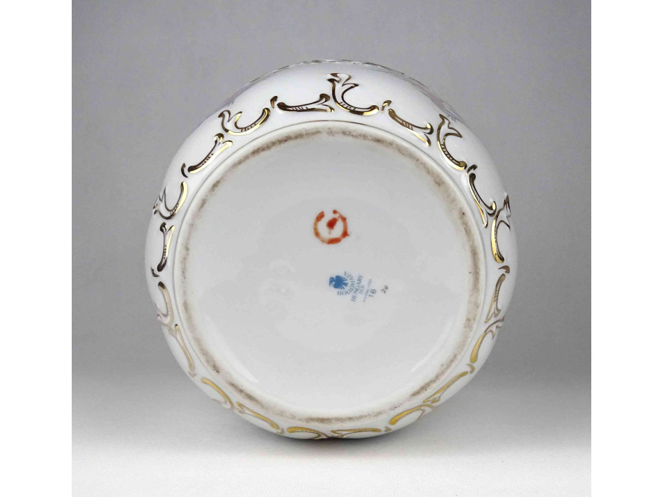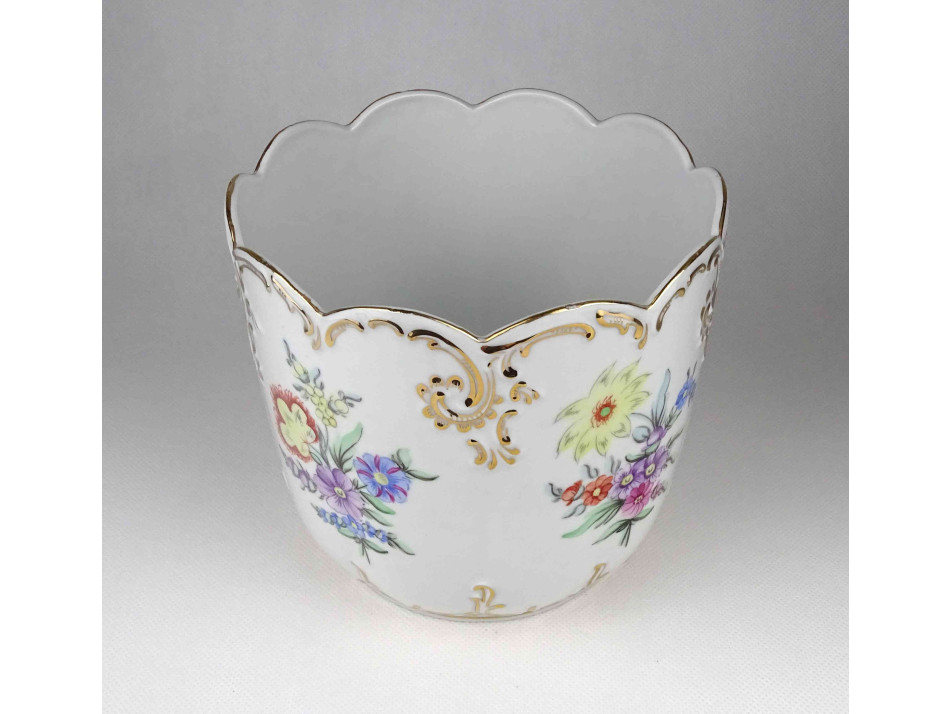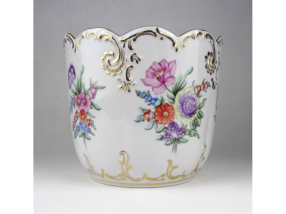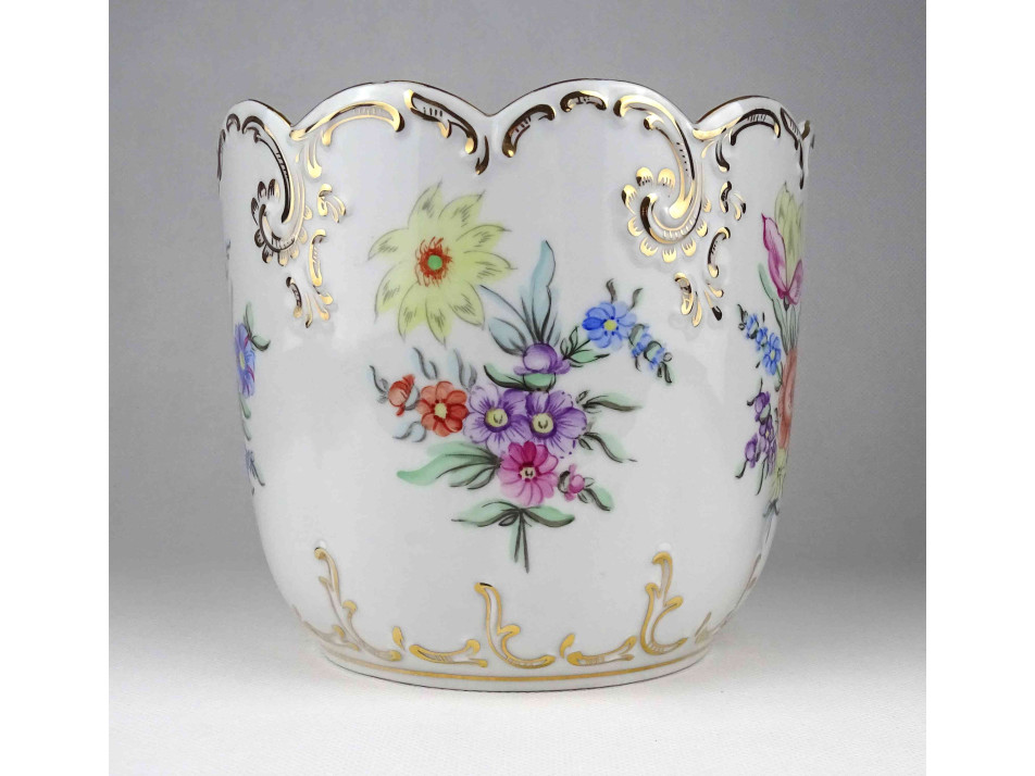 Hibátlan állapotú, nagyméretű, barokkos formavilágú, gazdagon aranyozott, kézzel festett virágmintás, jelzett Hollóházi porcelán kaspó.