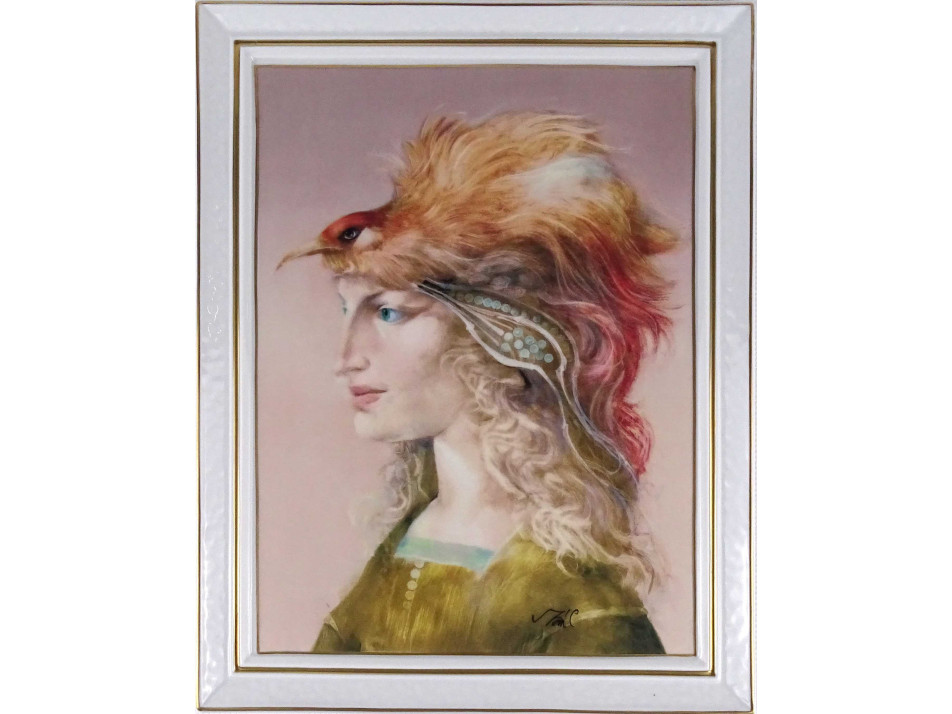 Hibátlan állapotú, valódi arannyal aranyozott, madaras fejdíszes női portrét ábrázoló Szász Endre hollóházi porcelán falikép. Falra akasztási lehetőséggel rendelkezik. Eredeti dobozában.