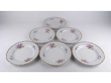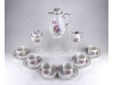 Szép állapotban lévő Erika mintás Hollóházi porcelán két személyes teáskészlet. A tejszínes kiöntő szájánál egy apró lepattanás található.