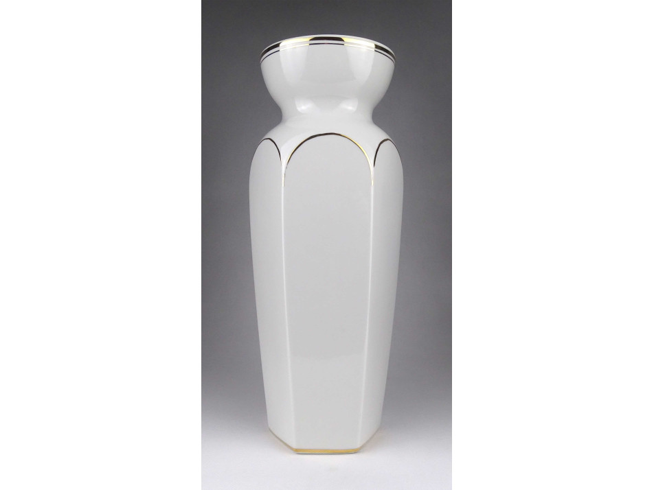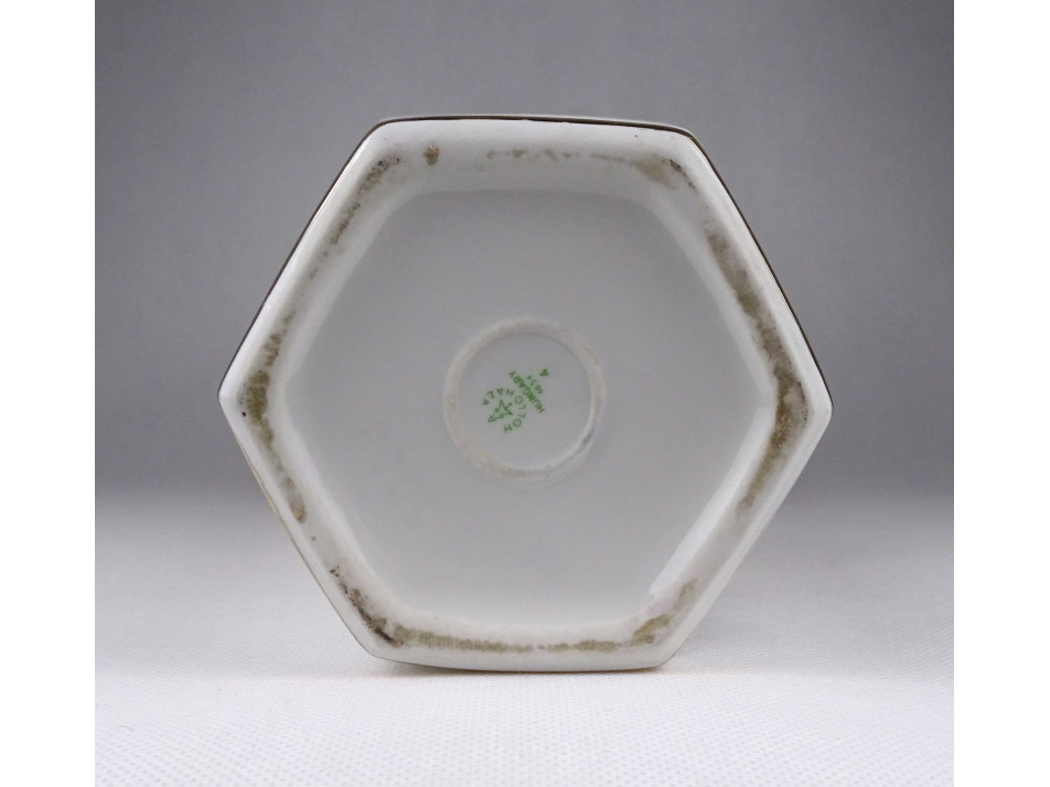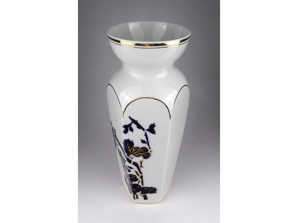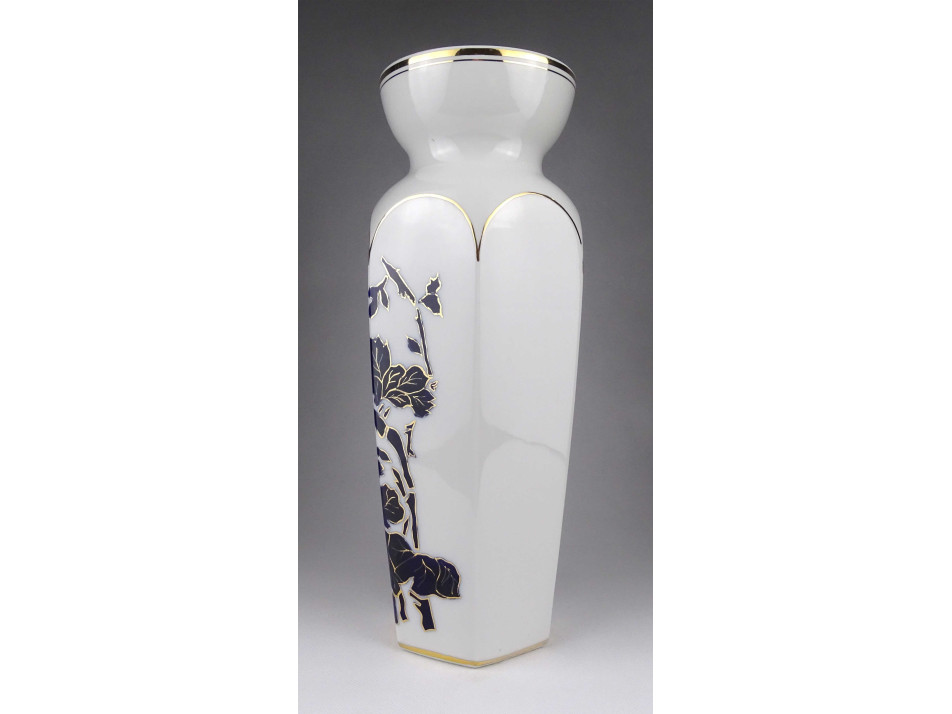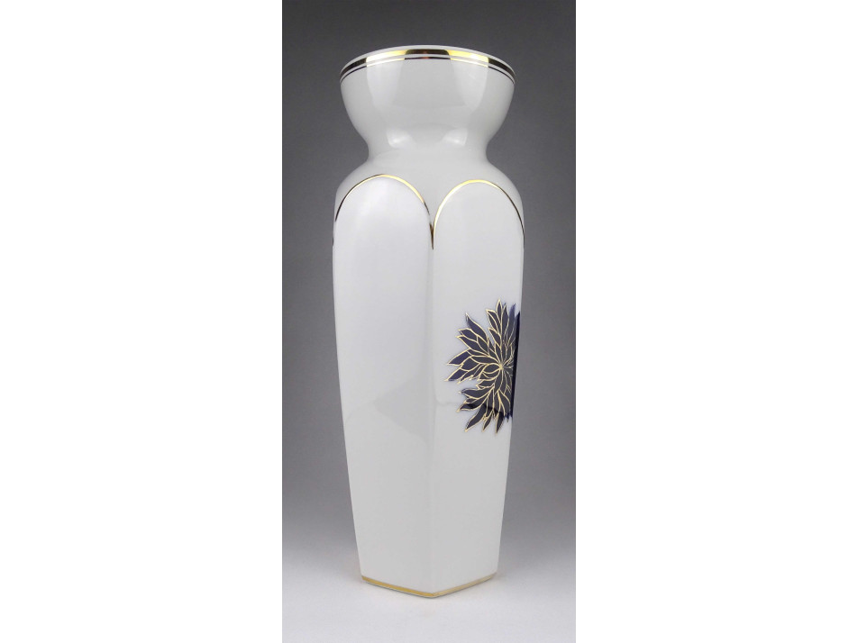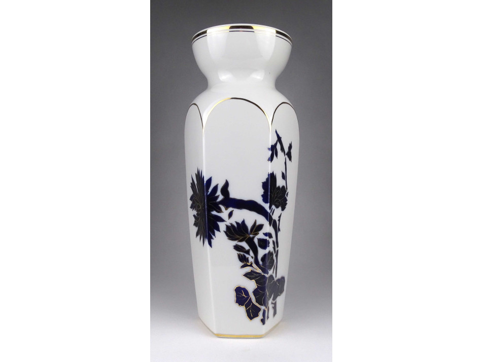 Hibátlan állapotú, nagyméretű, keleti sítílusú kék - arany színű virágmintás, hatszögletű Hollóházi porcelán váza, virágváza.