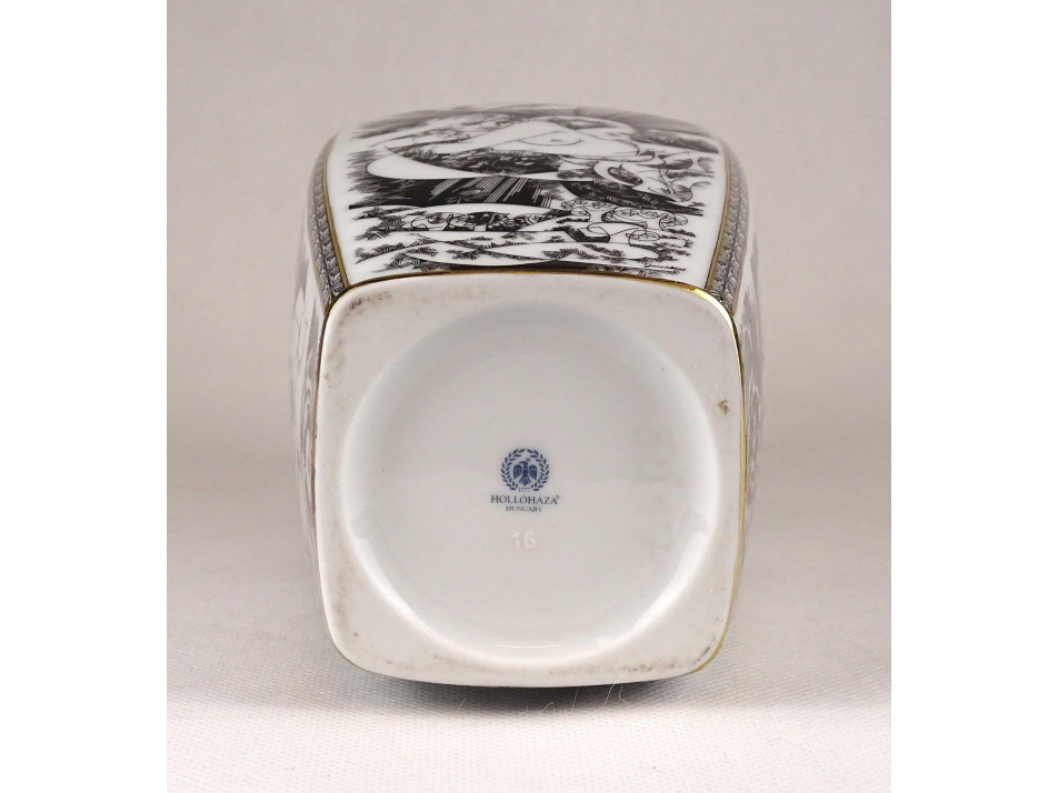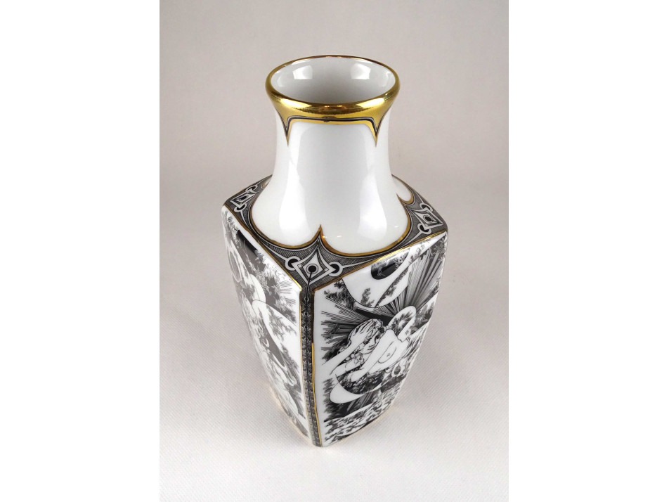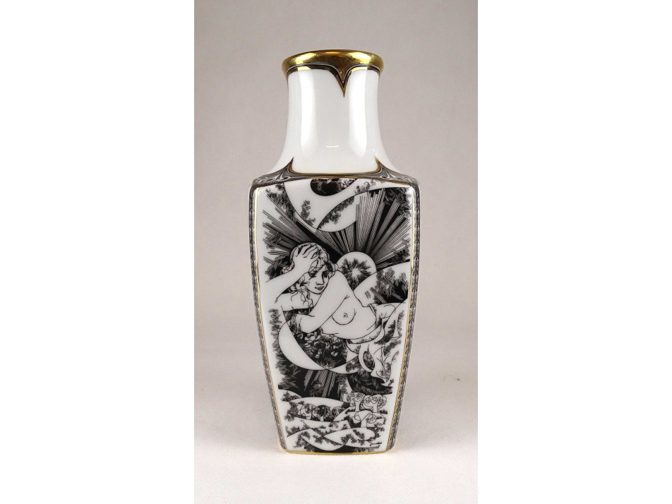 Nagyméretű, hibátlan állapotú, Jurcsák László nőalakokat ábrázoló rajzos, Érosz mintáival díszített, aranyozott, négyszögletű Hollóházi porcelán váza.
