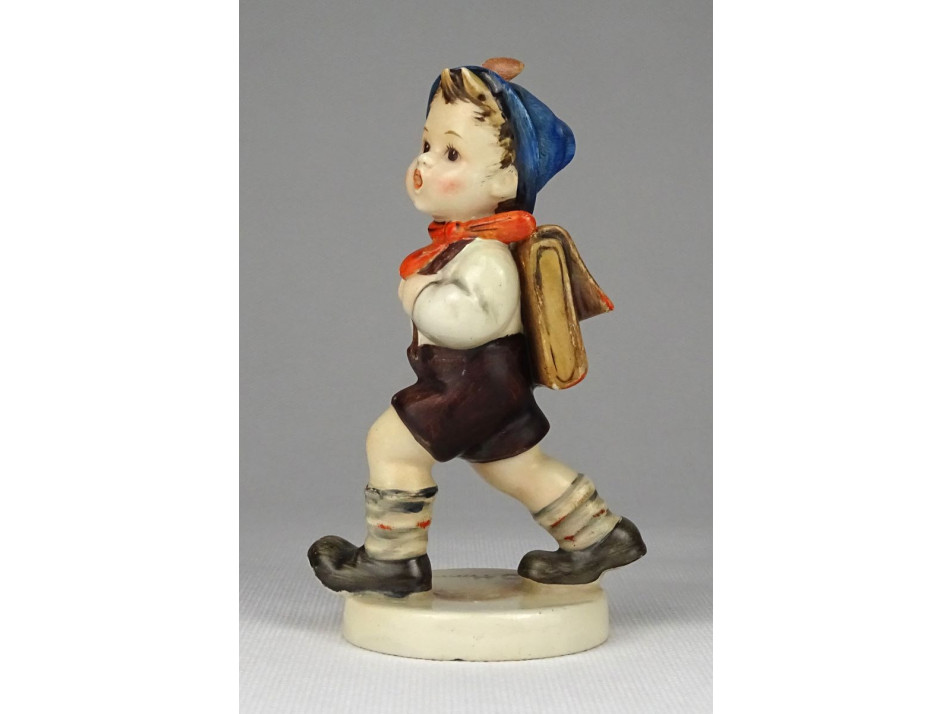 Hibátlan állapotú Hummel porcelán fiú figura tollas kalapban, hátizsákkal.