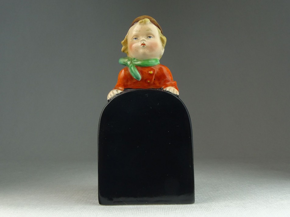 Antik, hibátlan állapotú, jelzett porcelán könyvtámaszték, melyet egy fapapucsos holland kisfiú tart.