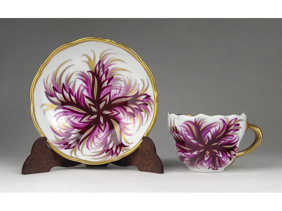 Hibátlan állapotú, jelzett, kézi festéssel díszített Meisseni kávéscsésze, hozzá tartozó alátét tányérral. Széle és belseje gazdagon aranyozott.