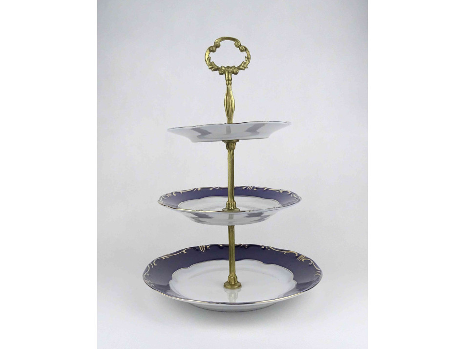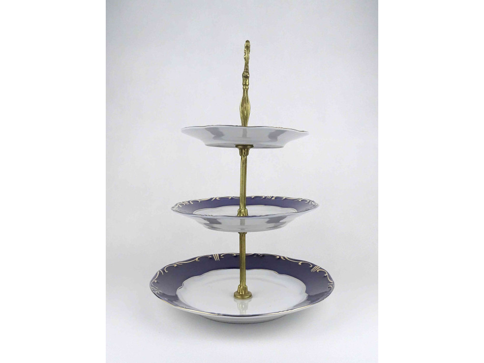 Hibátlan állapotú, Zsolnay Pompadour porcelán emeletes kínáló tál, kék szegéllyel, gazdagon aranyozva.