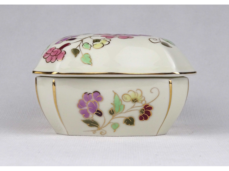 Különleges, hibátlan állapotú, vajszínű, aranyozással gazdagon díszített, lepkés, pillangós virágmintás porcelán gyűrűtartó, ékszertartó bonbonier.