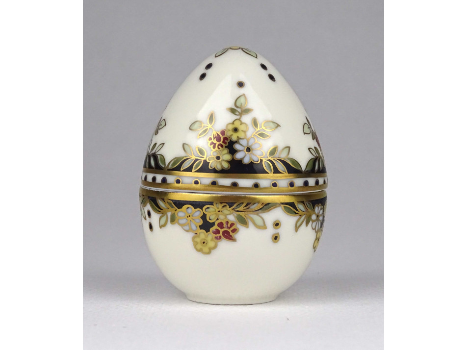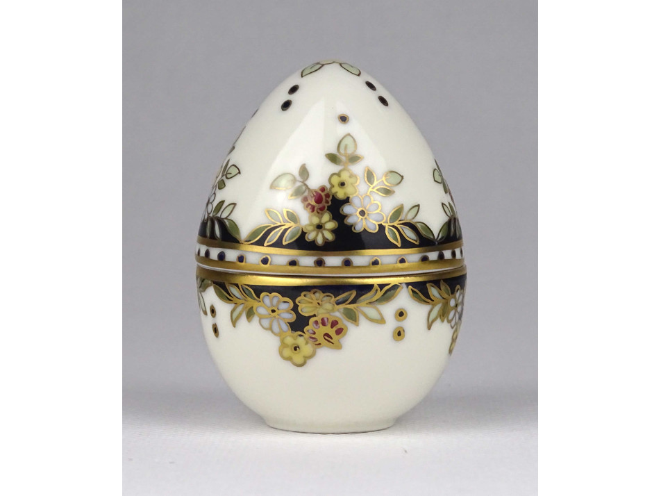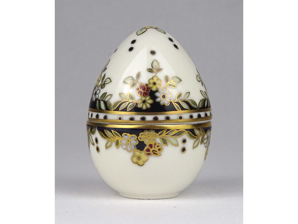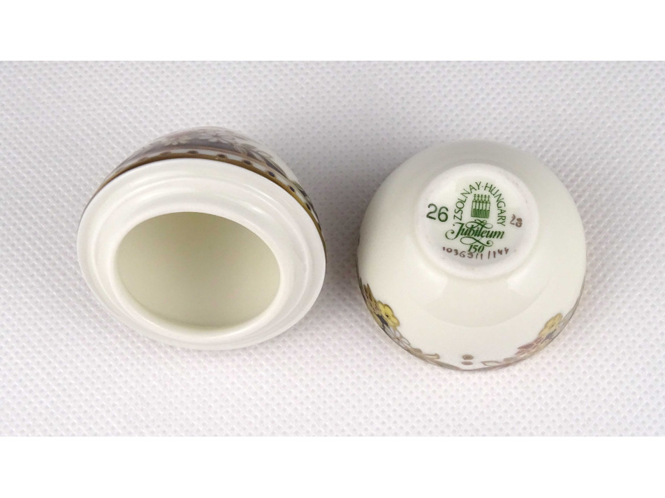 Hibátlan állapotú, vajszínű, álló tojás alakú, különleges Sissy mintás Zsolnay porcelán gyűrűtartó, ékszertartó bonbonier.