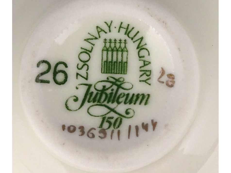 Alján zöld színű jubileumi Zsolnay öttornyú márkajelzés: