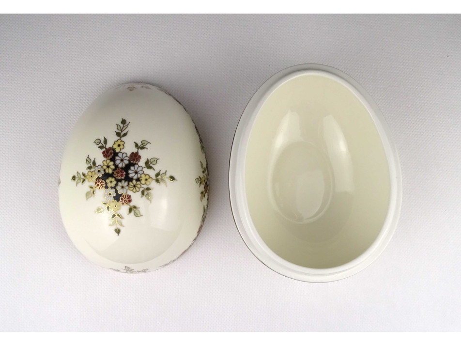 Hibátlan állapotú, vajszínű, aranyozással gazdagon díszített, nagyméretű, tojás alakú, különleges Sissy mintás Zsolnay porcelán gyűrűtartó, ékszertartó bonbonier.