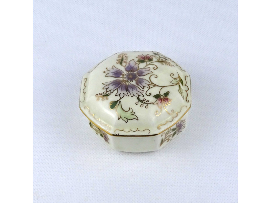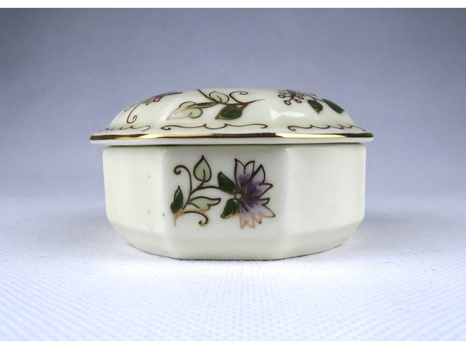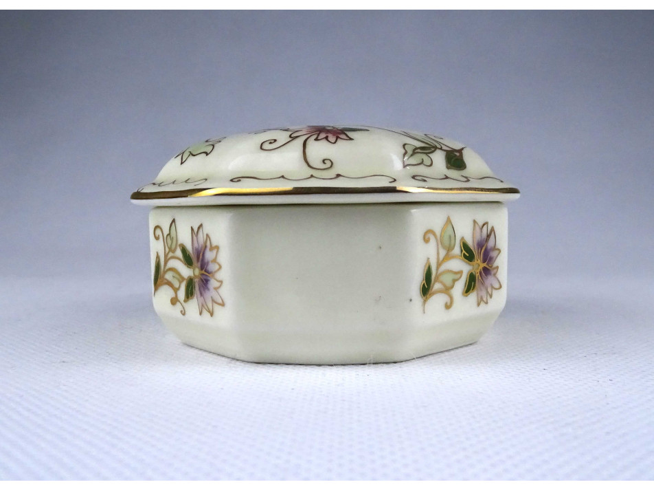 Vajszínű virágmintás nyolcszögletű Zsolnay porcelán bonbonier 9 cm