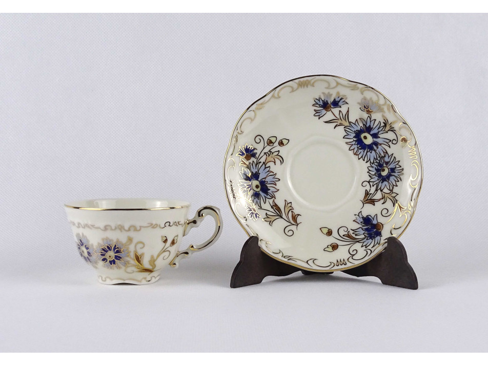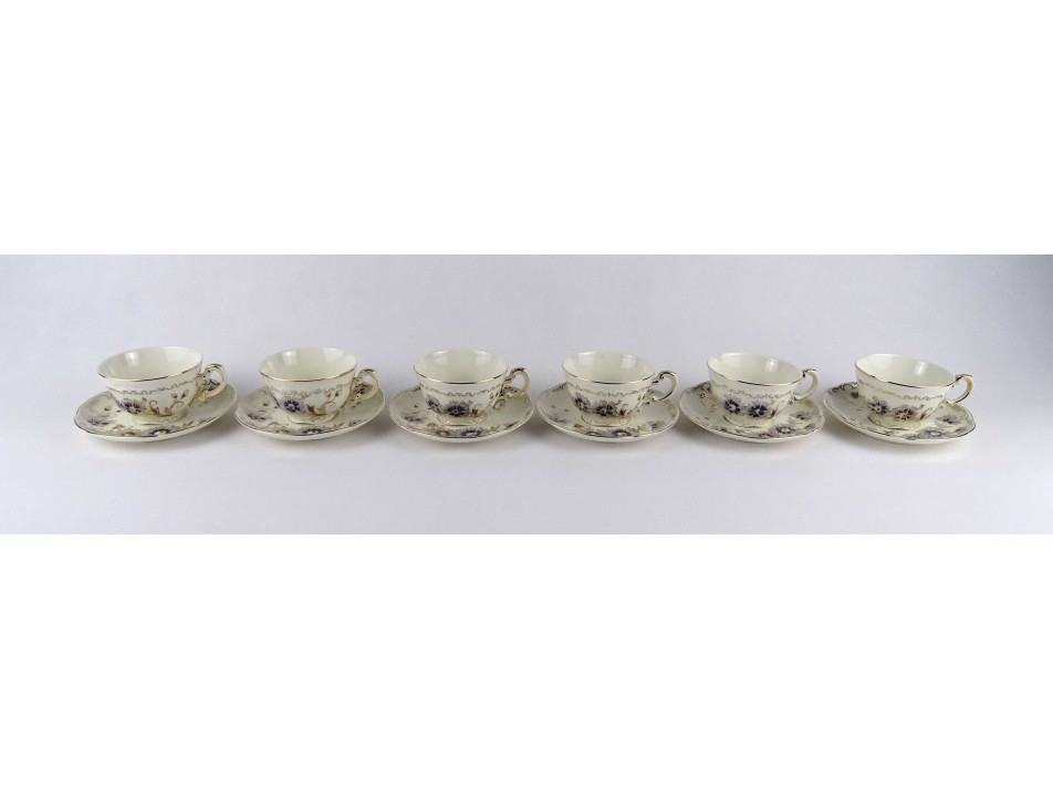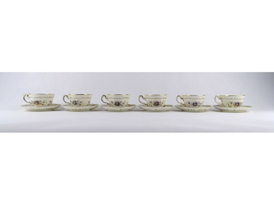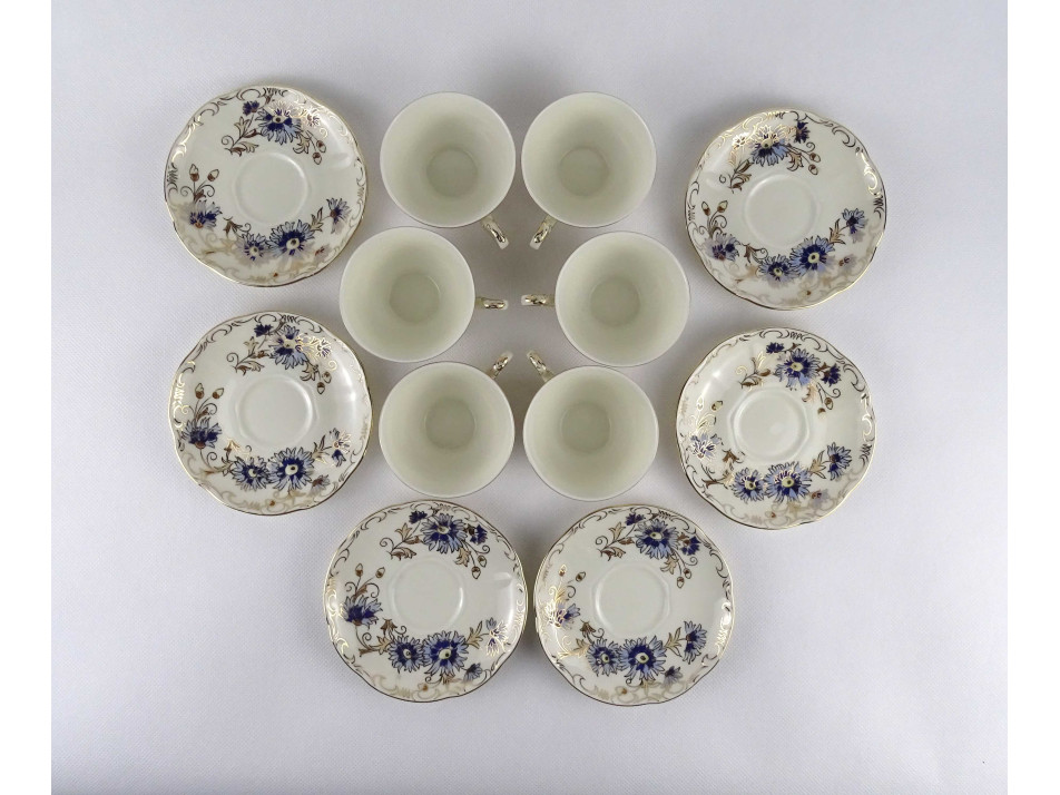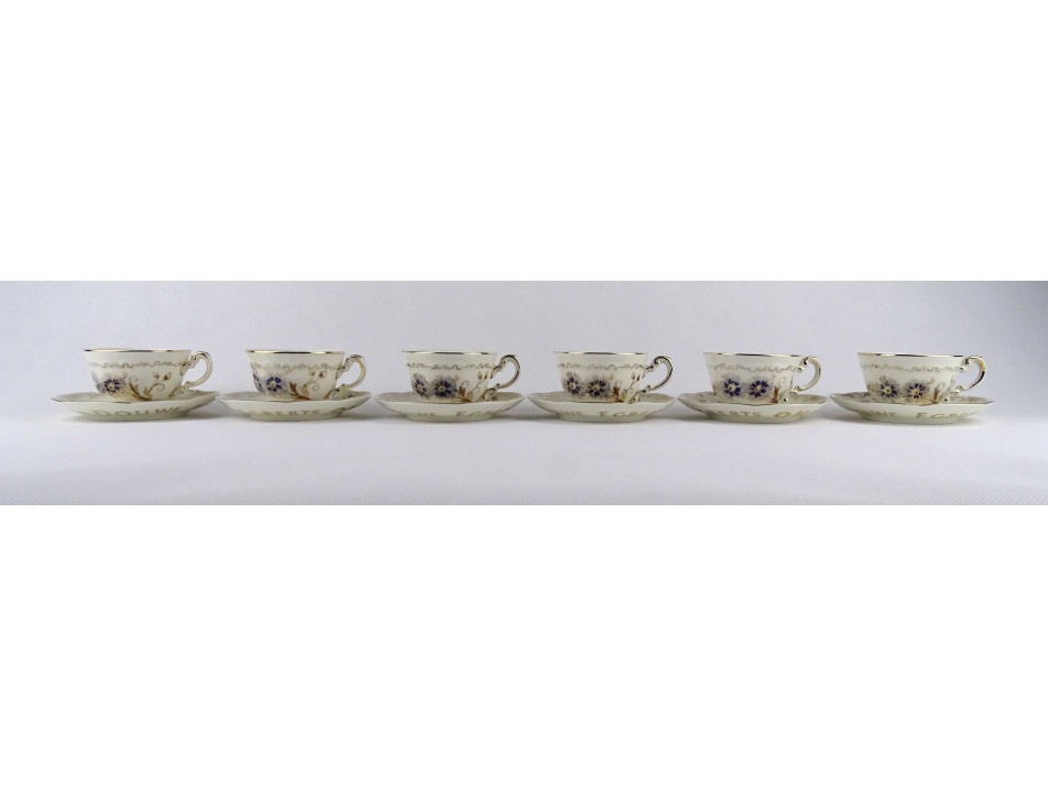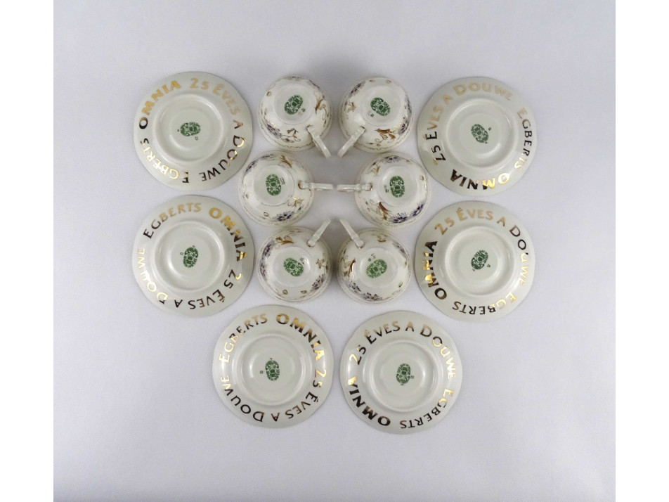 Régi, jelzett, búzavirág mintás Zsolnay porcelán kávéskészlet. Az alátét tányérok alján a - 25 ÉVES A DOUWE EGBERTS OMNIA - aranyozott felirat található.