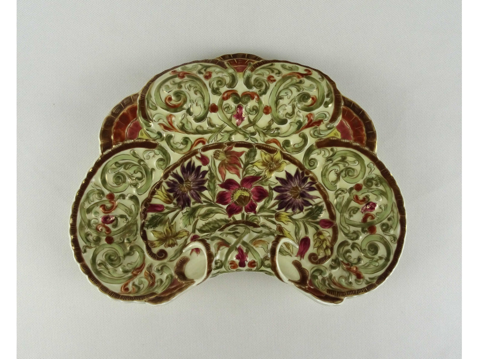 Nagy méretű vajszínű virágmintás Zsolnay kagyló alakú porcelán névjegytál 30 cm