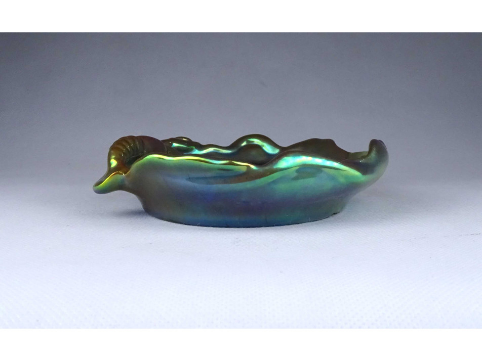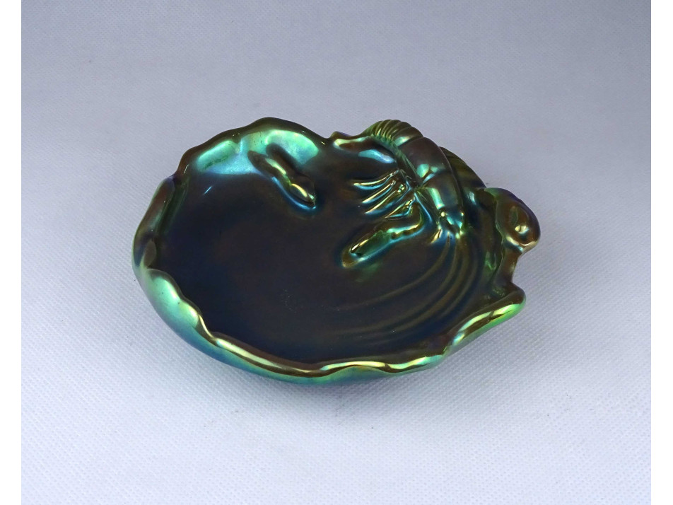 Régi, hibátlan állapotú, zöld eozin mázas Zsolnay porcelán névjegykártyatartó tál, kínáló tál, hamutál. A tál széle fodros, hullámos. A tálat egy nagy méretű rák vagy homár díszíti.