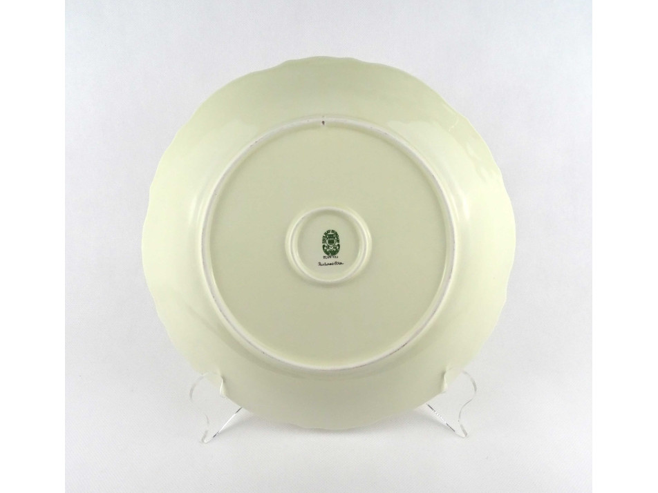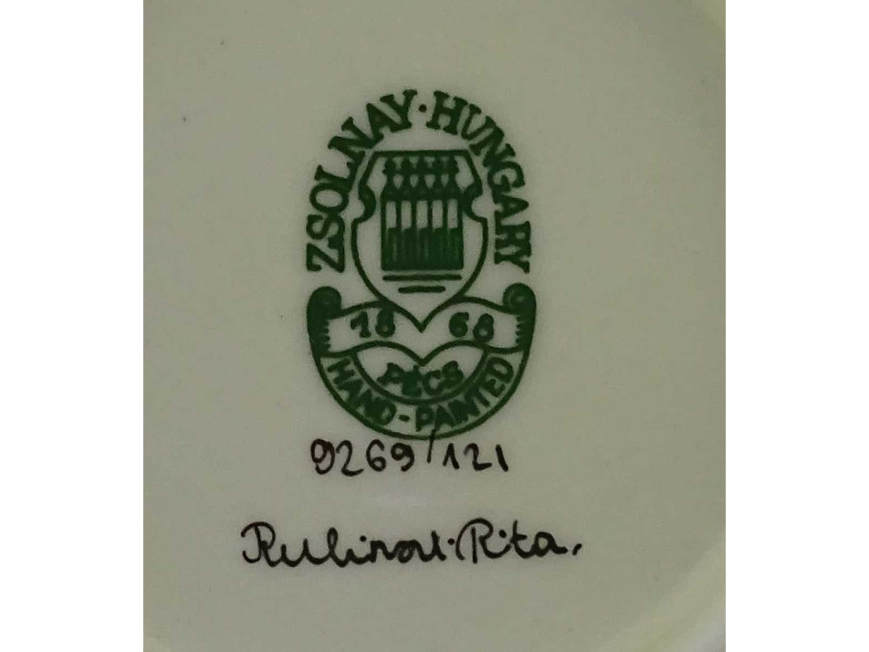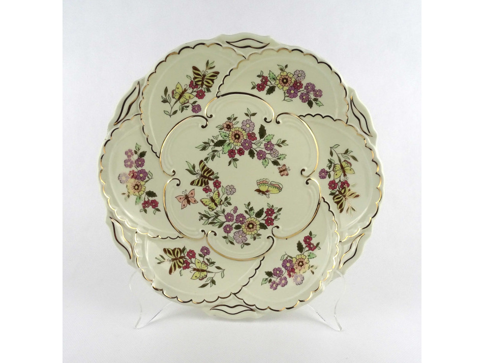 Nagy méretű, hibátlan, gazdagon aranyozott vajszínű Zsolnay porcelán tál, fali tál. Akasztási lehetőséggel rendelkezik. Kézzel festett lepke és virág motívumokkal díszített.