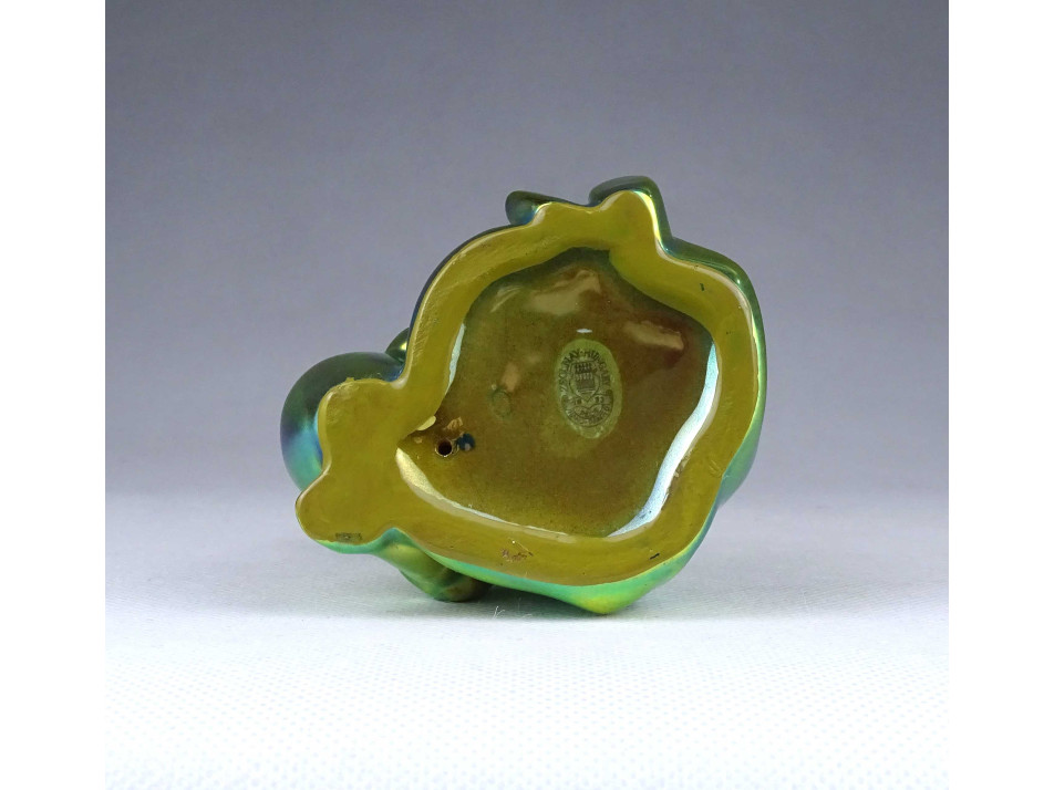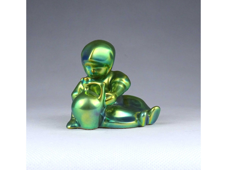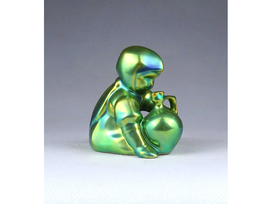 Régi, hibátlan állapotú, zöld eozin mázas Zsolnay porcelán figura, kislány kezében csöcsös korsó.