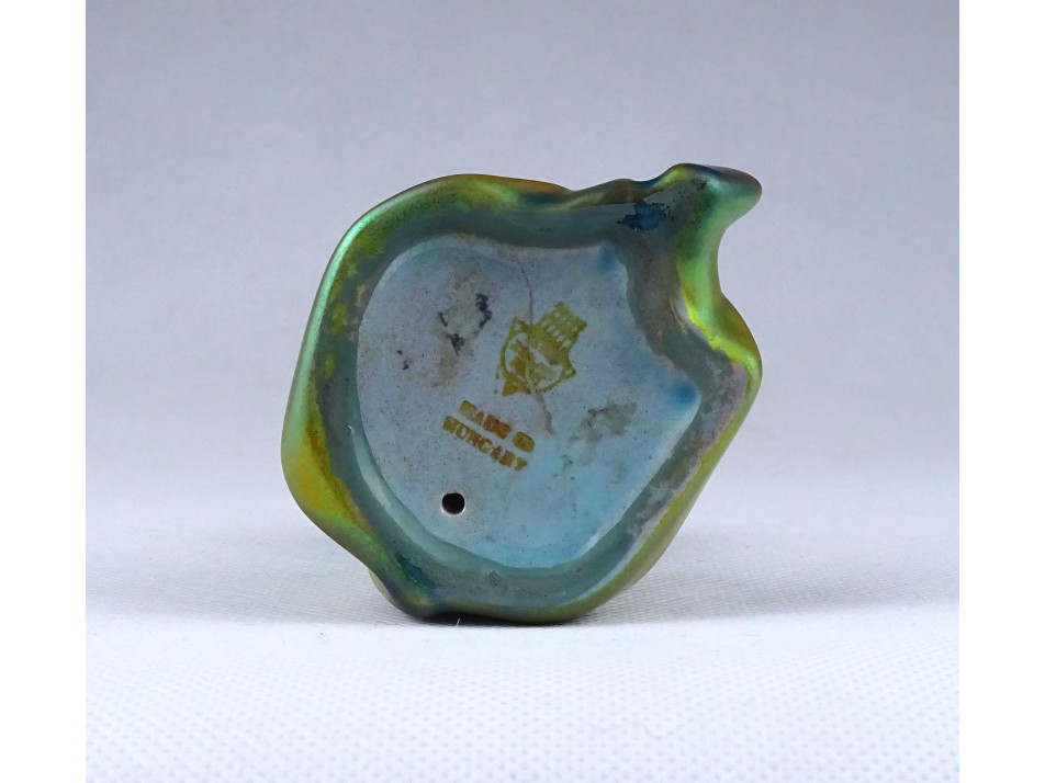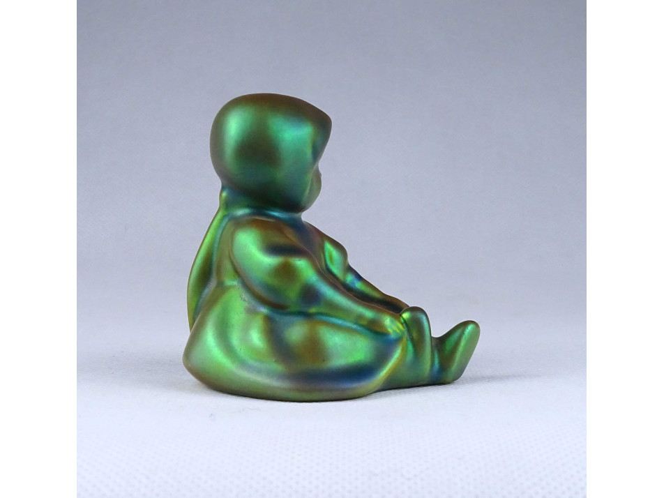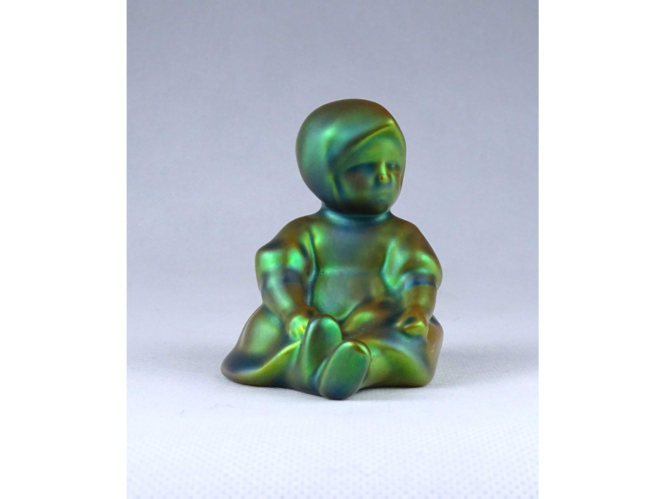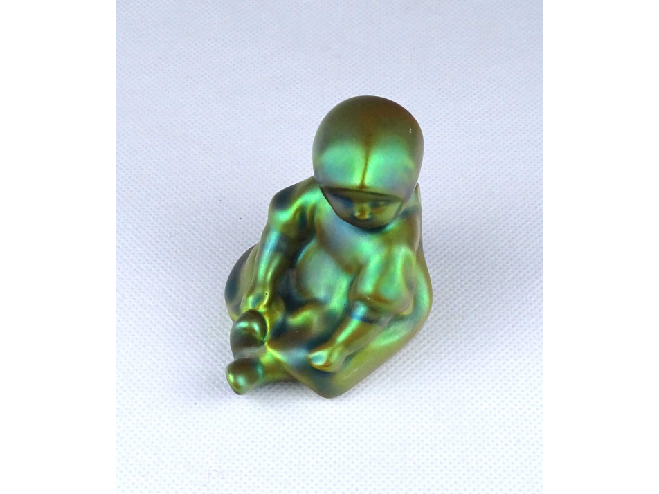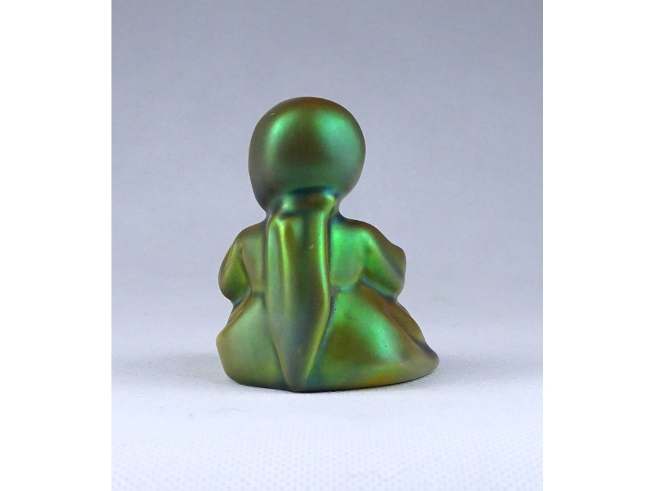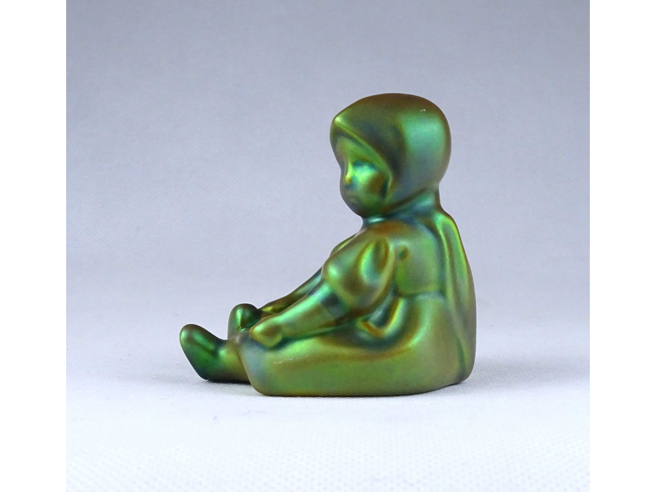 Régi, hibátlan állapotú, eozin mázas Zsolnay porcelán figura, szobor, fejkendős ülő kislány.