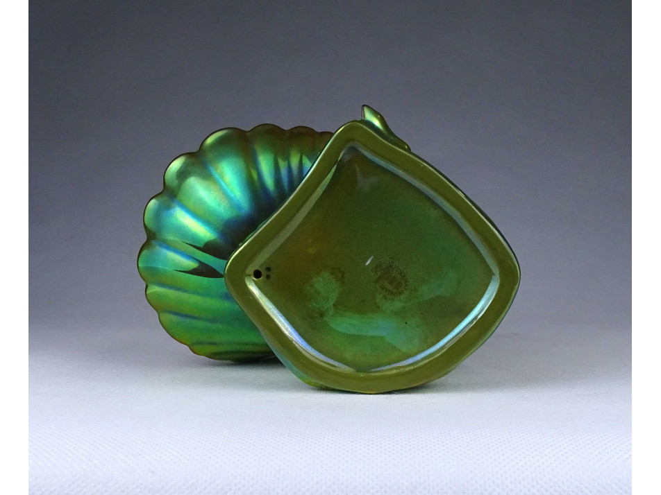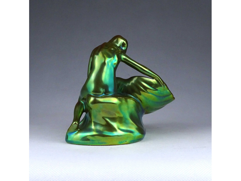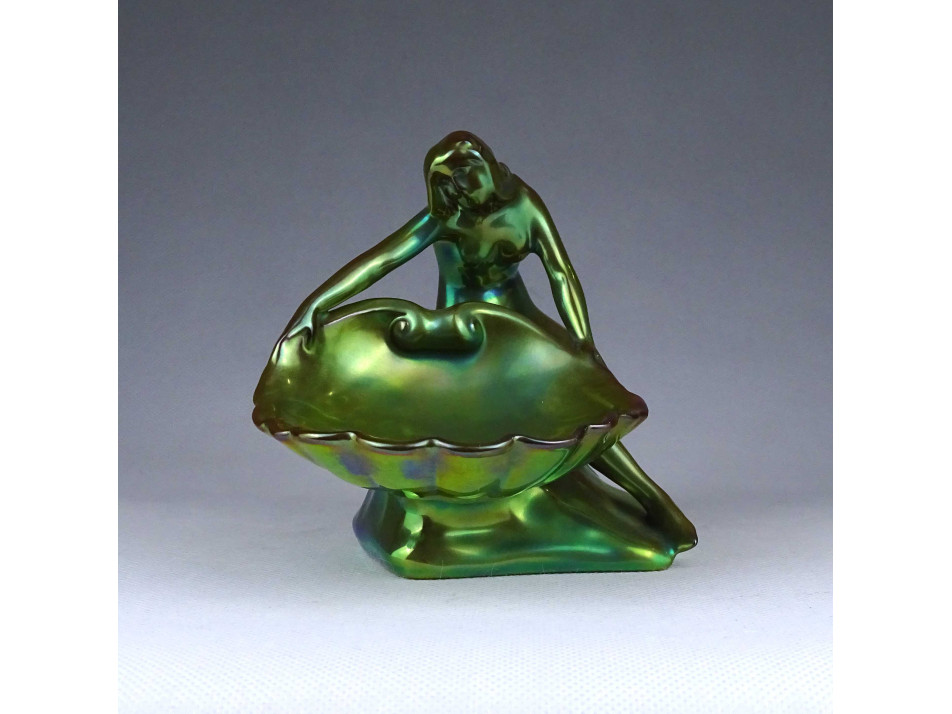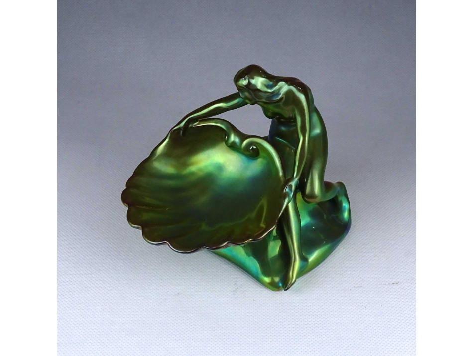 Régi, hibátlan állapotú, zöld eozin mázas, jubileumi jelzéses Zsolnay porcelán, figurális tál, kagylót tartó női akt névjegykártya tartó, íróasztali kellék.