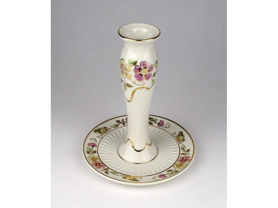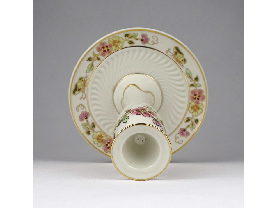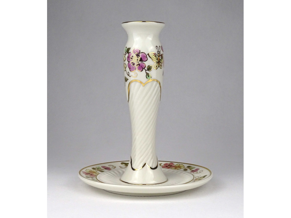 Hibátlan állapotú, vajszínű, aranyozással gazdagon díszített, pillangós, virágmintás, talpas gyertyatartó.