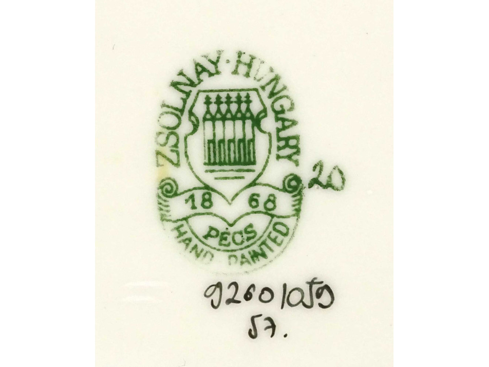 Alján zöld Zsolnay-Pécs öttornyú márkajelzés: