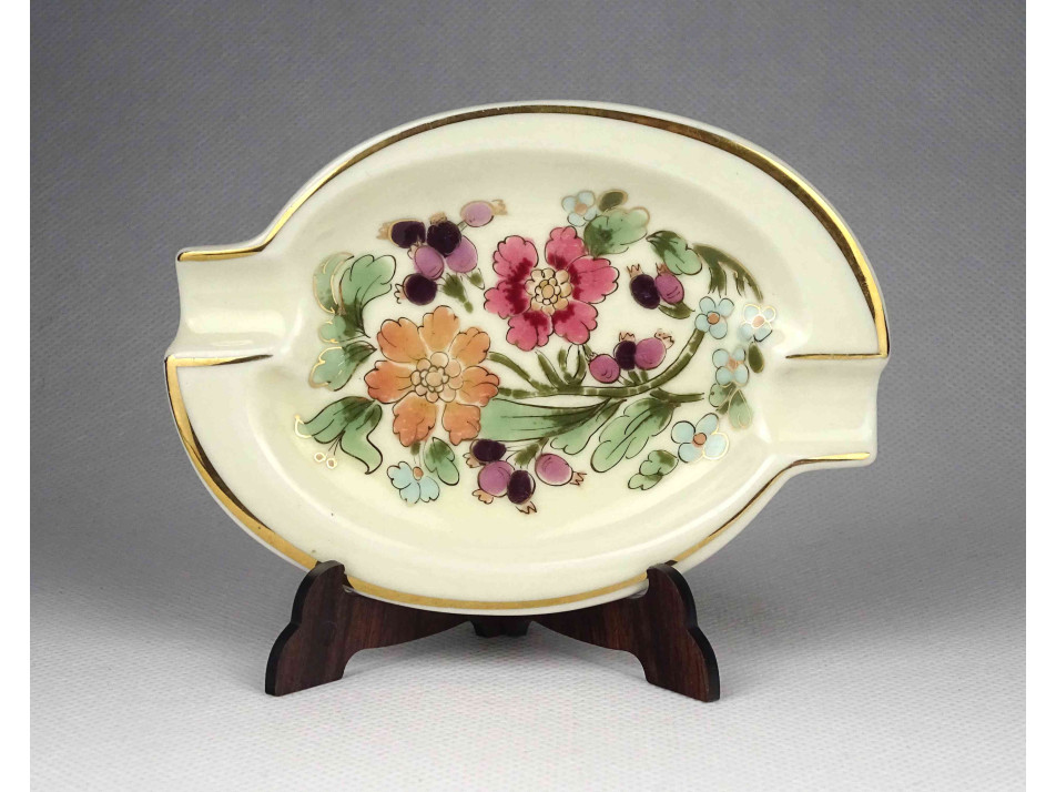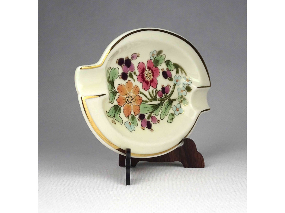 Hibátlan állapotú, vajszínű, virág mintás Zsolnay porcelán hamutál, hamutartó, szélén körben aranyozással.