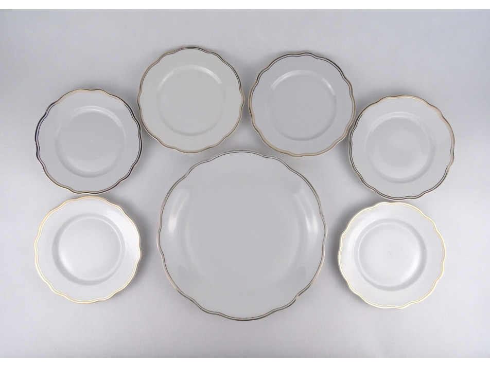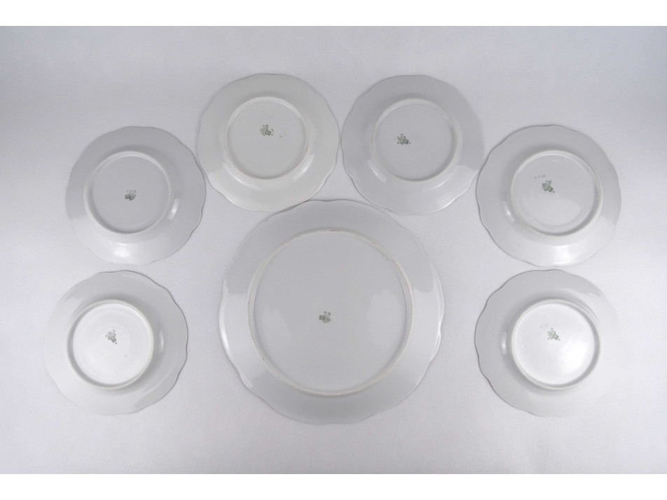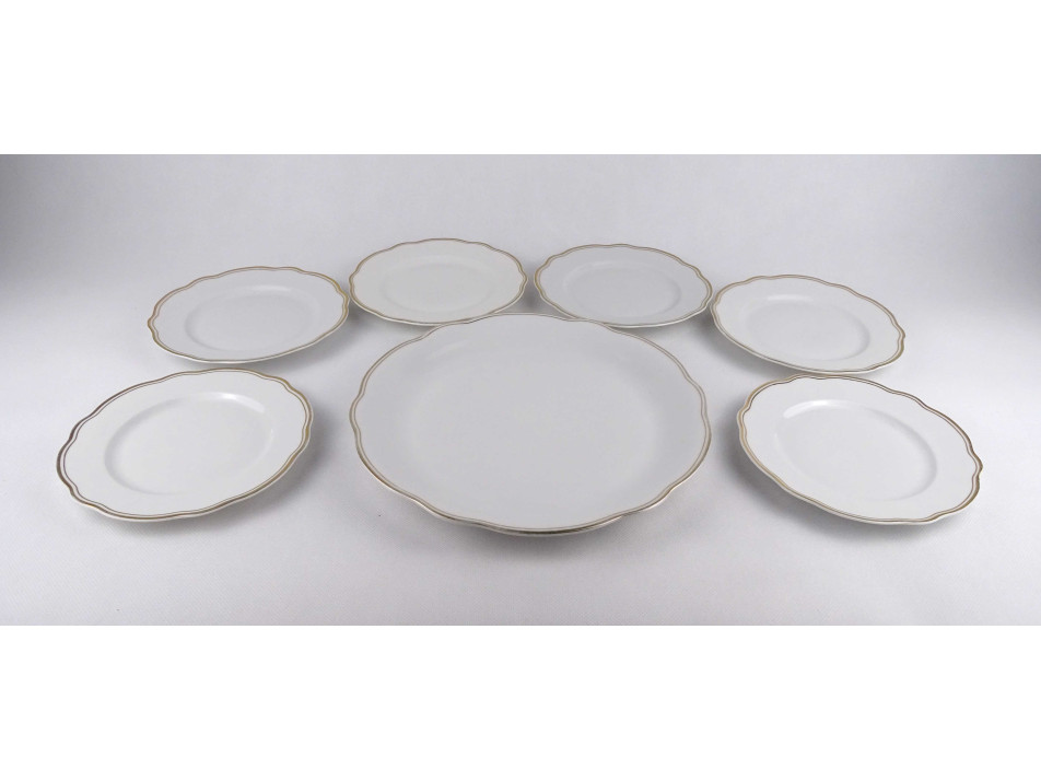 Régi, hibátlan állapotú, 6 személyes aranyozott szélű, festetlen Zsolnay porcelán süteményes készlet, tortás készlet. 7 darabos.