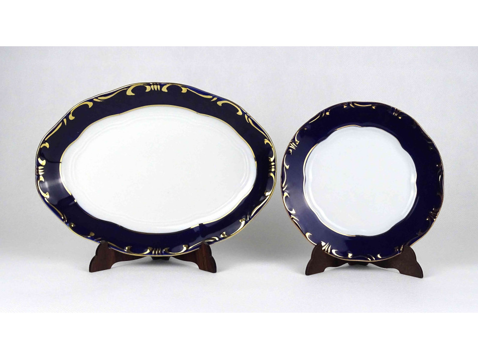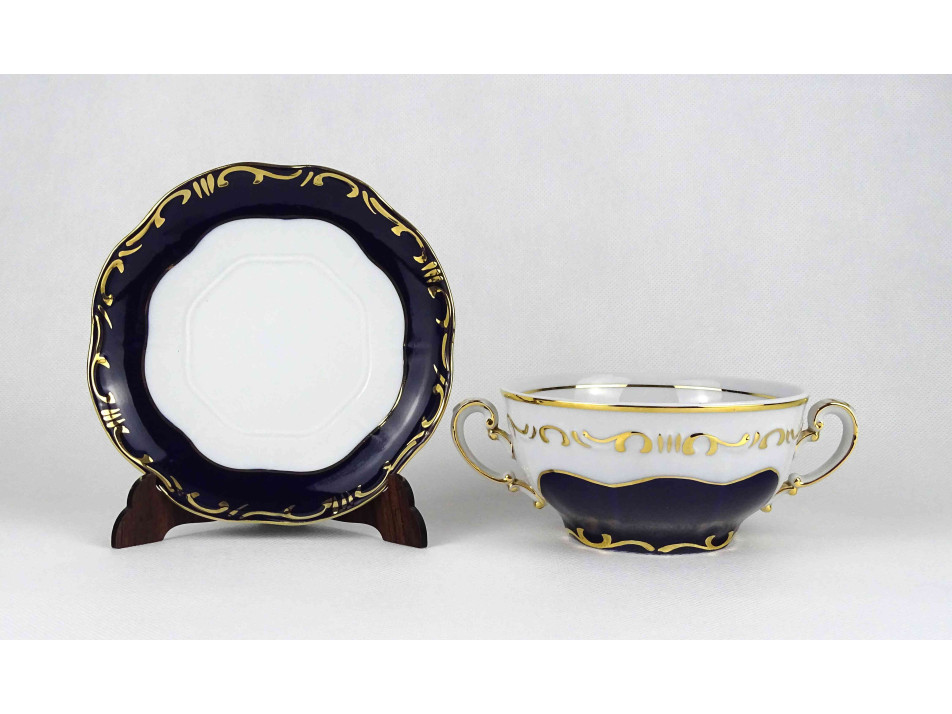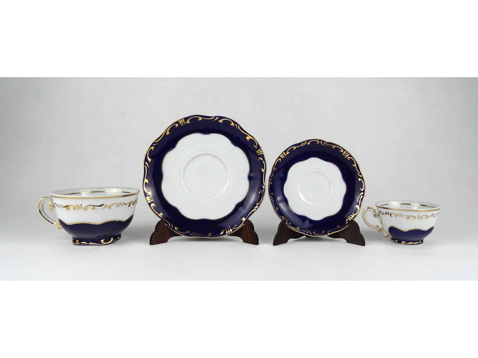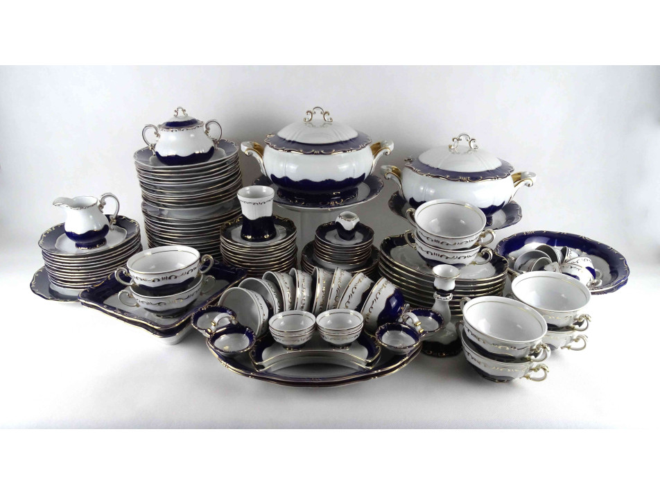 Hibátlan állapotú, kobaltkék mázzal festett és aranyozott peremű Zsolnay pompadour étkészlet, süteményes készlet, kávés és teás készlet sok kiegészítővel.