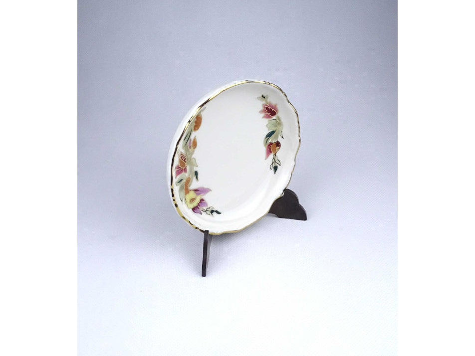 Hibátlan állapotú, gazdagon aranyozott és orchidea mintákkal díszített, vajszínű Zsolnay porcelán hamutál, hamus.