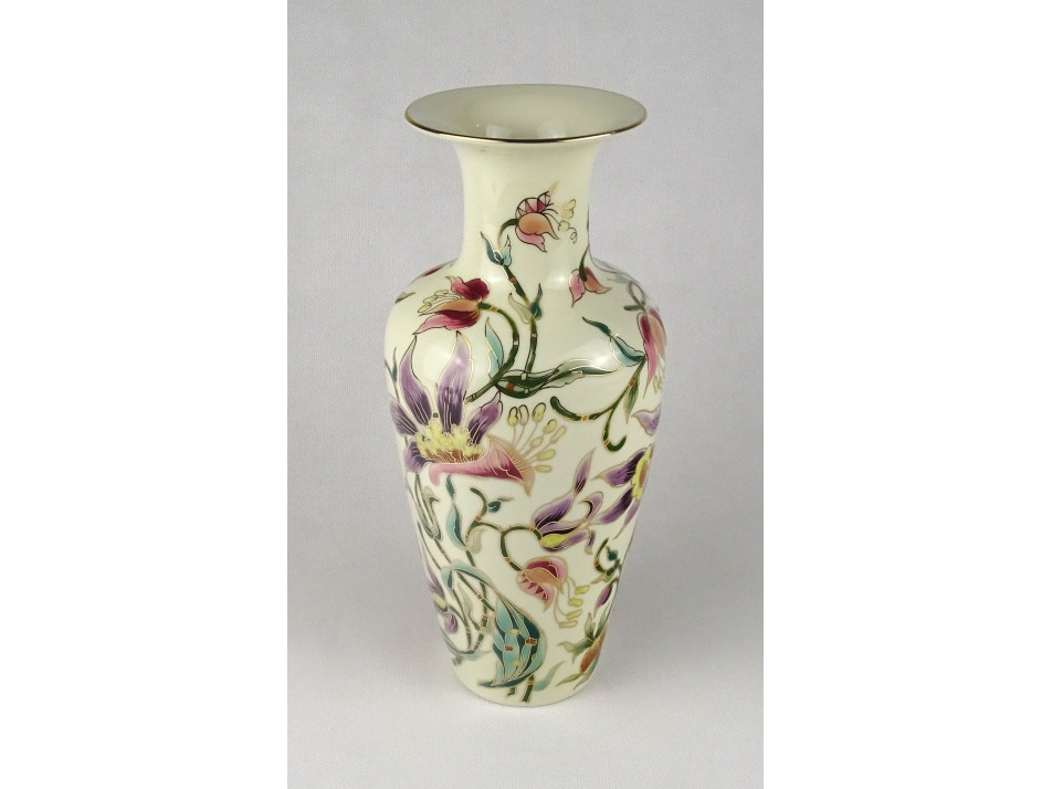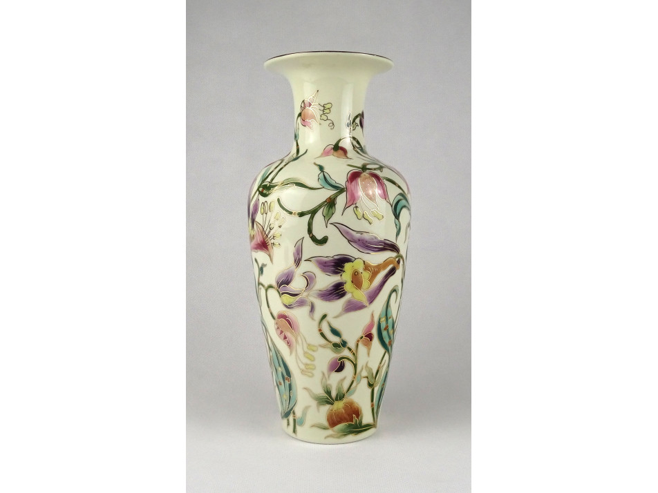 Hibátlan állapotú, újszerű, jelzett, vajszínű, gyönyörű kézi festésű orchidea díszítéses, gazdagon aranyozott Zsolnay vajszínű porcelán váza.