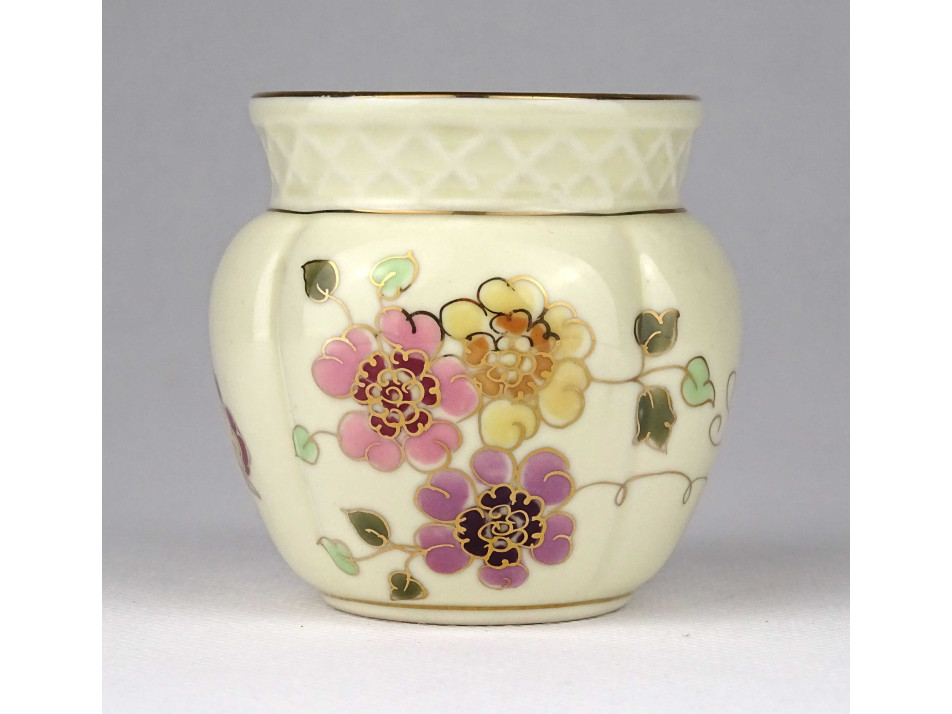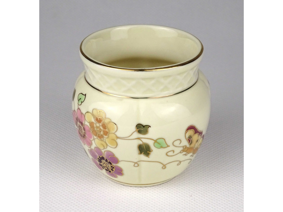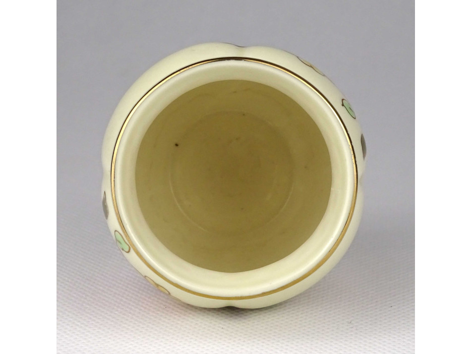 Hibátlan állapotú, gazdagon aranyozott, pillangó mintával díszített, kaspó alakú, kisméretű vajszínű porcelán váza.