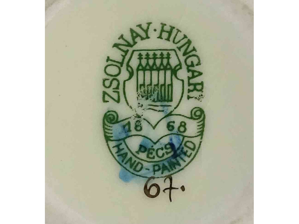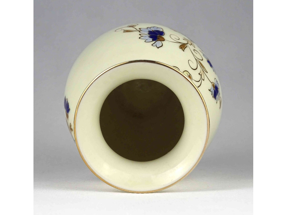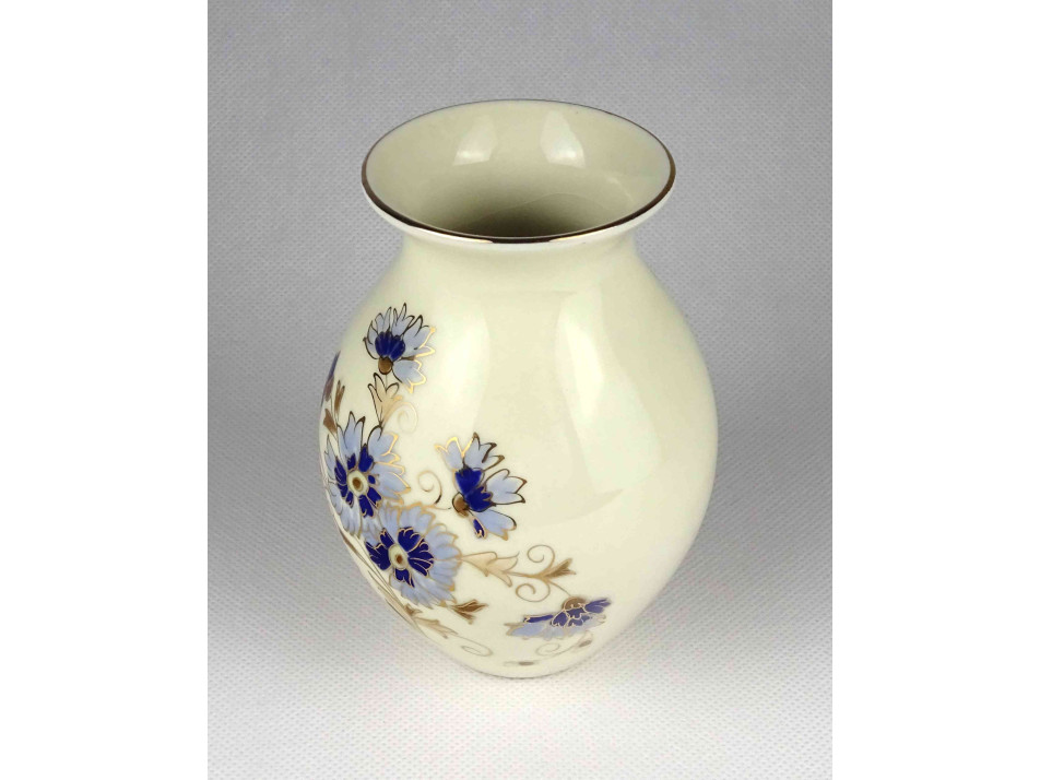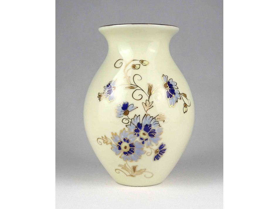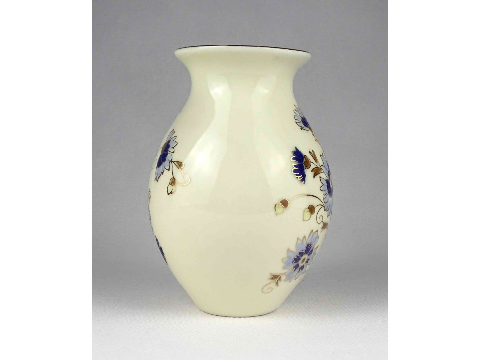 Hibátlan állapotú, vajszínű aranyozott Zsolnay porcelán díszváza búzavirág mintás díszítéssel. A mázat a váza teljes felületén apró repedések borítják.