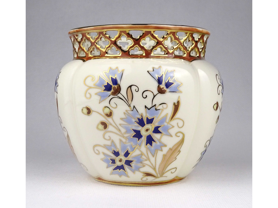 Hibátlan vajszínű áttört búzavirágos Zsolnay porcelán kaspó 10 cm