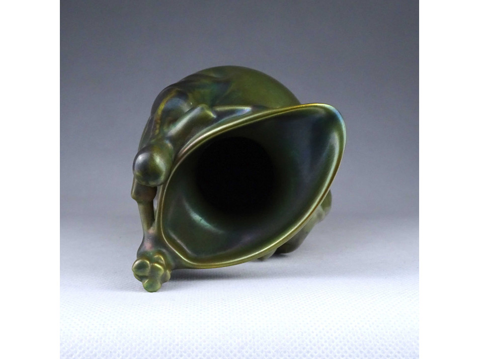 Régi, hibátlan állapotú, zöld eozin mázas Zsolnay porcelán kancsó alakú váza. Oldalán két plasztikus nőalakkal.