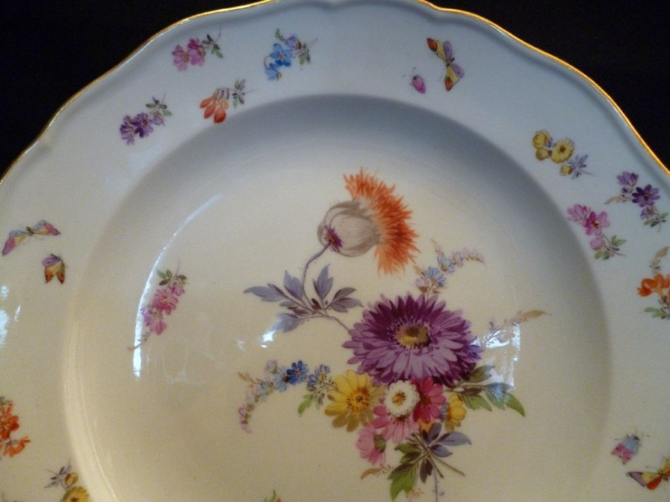 Virágmintás, lepke, bogár, rovar kézi festésű díszítéssel, szélén körben dúsan aranyozott.