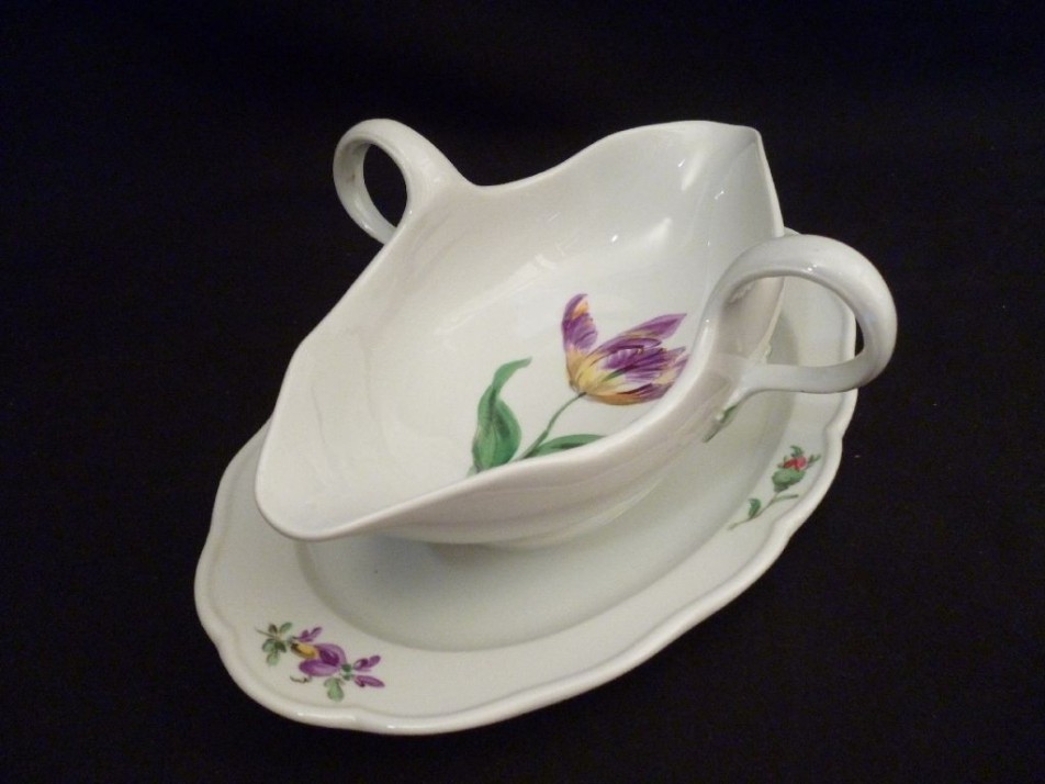 Antik vastagfalú virágmintás kézi festésű kardos Meisseni szószos tál. Hibátlan állapotú.