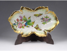 Hibátlan állapotú, aranyozott szélű, gyönyörű, kézi festésű virág, lepkemotívummal díszített kis méretű porcelán kínáló tál, gyűrűtartó tál, tálka.