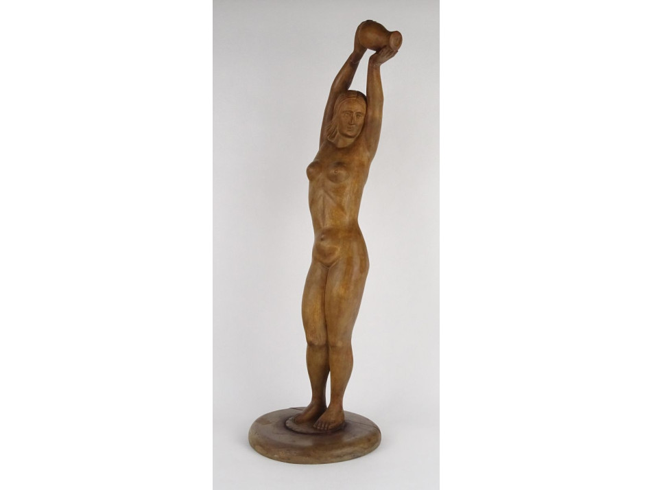 Régi nagy méretű, talapzaton álló egészalakos női akt szobor. Faragott vízöntő nő szobor, fafaragás.