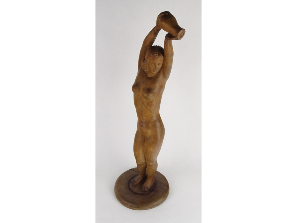 Régi nagyméretű vízöntő egészalakos női akt faragott fa szobor 53 cm