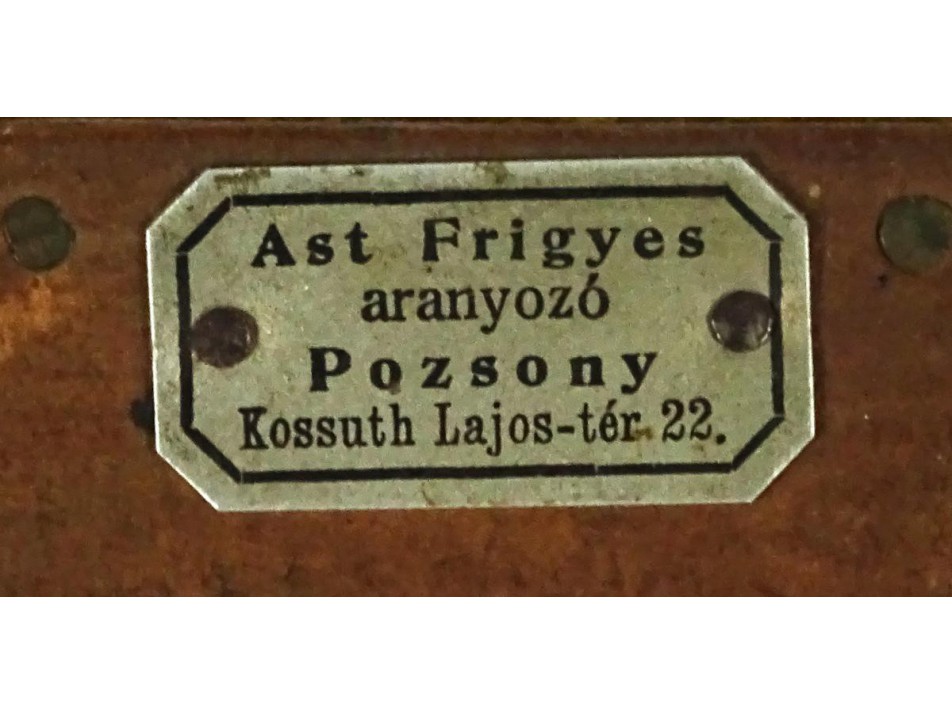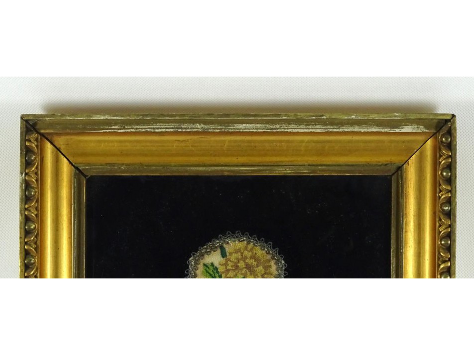 Antik ökörszemes aranyozott keretben, üveglap mögött található finom tűgobelin. Hosszúkás alakú virágdíszes kézimunka. A keret az 1800-as évekből való, felső részén hiányos. Akasztási lehetőséggel rendelkezik.
