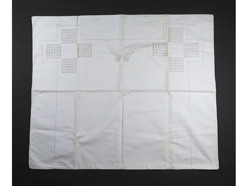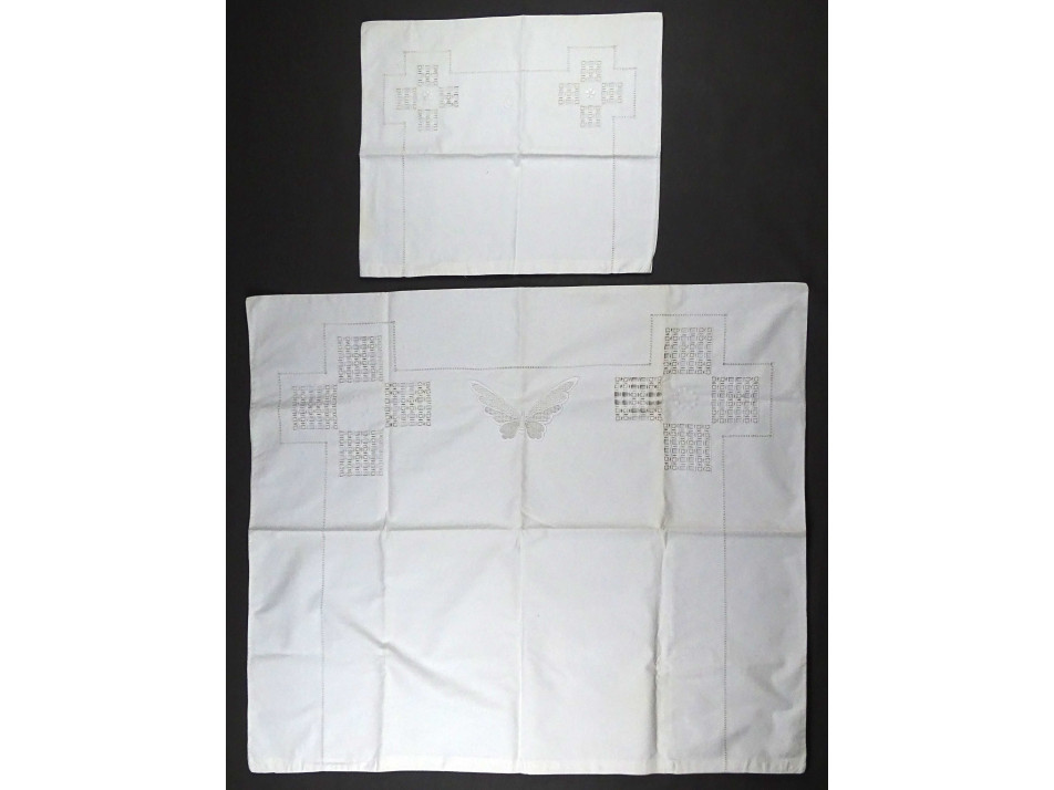 Régi, hibátlan, újszerű állapotú, horgolt pillangóval díszített, vékony fehér vászon párnahuzat garnitúra.