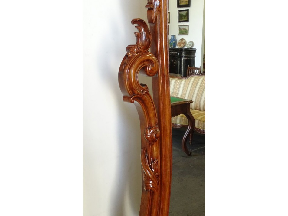 Antik, gyönyörű, faragványokkal gazdagon díszített, egész alakos, billenthető, barokk álló tükör, eredeti felújítatlan állapotában. Kimagaslóan jó minőségű faragásokkal. Benne lévő tükör eredeti, alsó harmada vakfoltos, hátulja deszkázott.