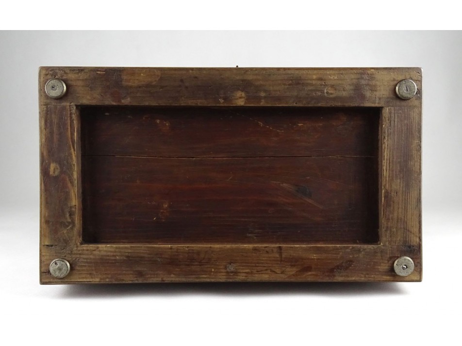 Antik, szép állapotú billenő tükrös, fiókos pipere vagy borotválkozó tükör. Benne metszett, fazettázott vakfolt mentes tükör található. Két részre osztott fiókja működő zárral és egy darab kulccsal rendelkezik. A tükröt tartó réz csavar feje félholdat mintáz. A furnérozott felületeket finom vonal intarzia díszíti. Néhány kisebb furnérhiba található rajta, lásd fotó.